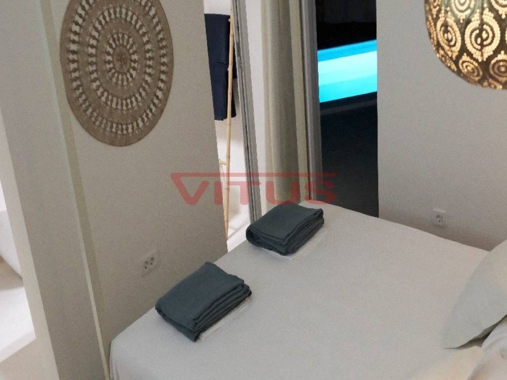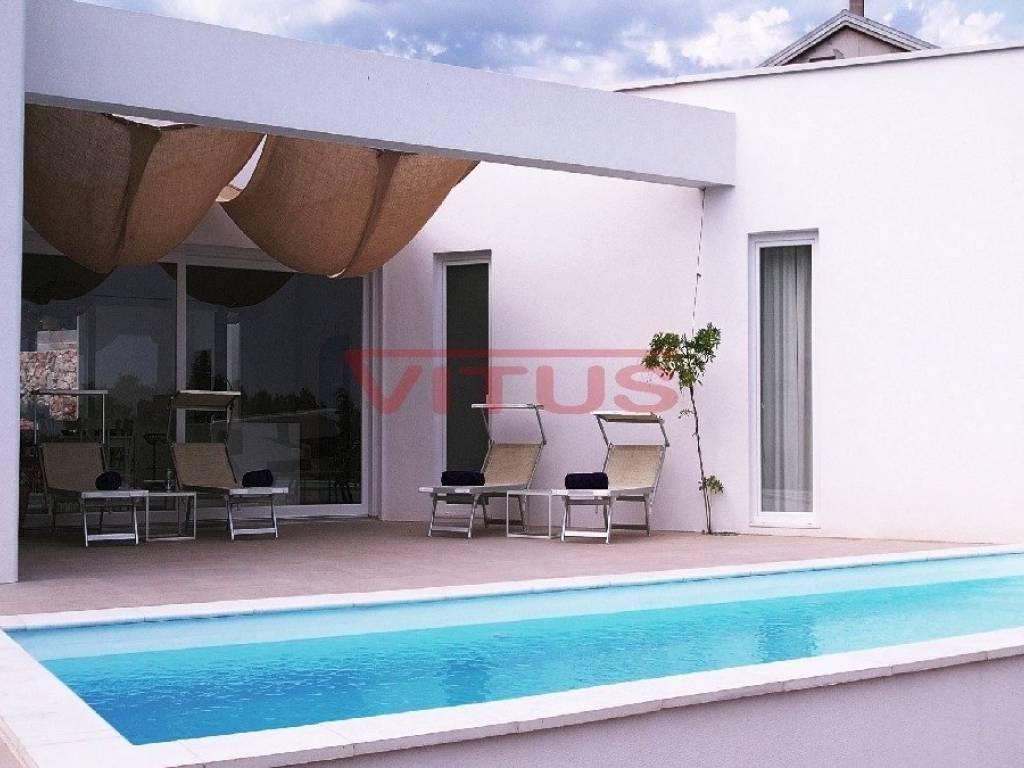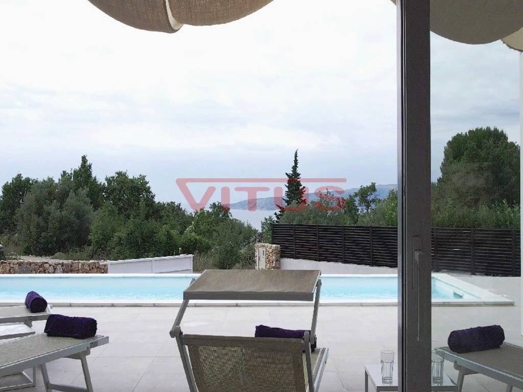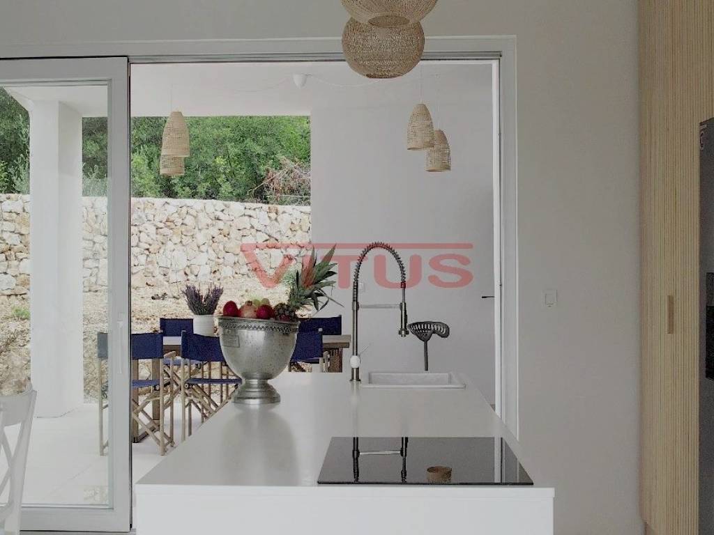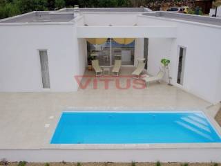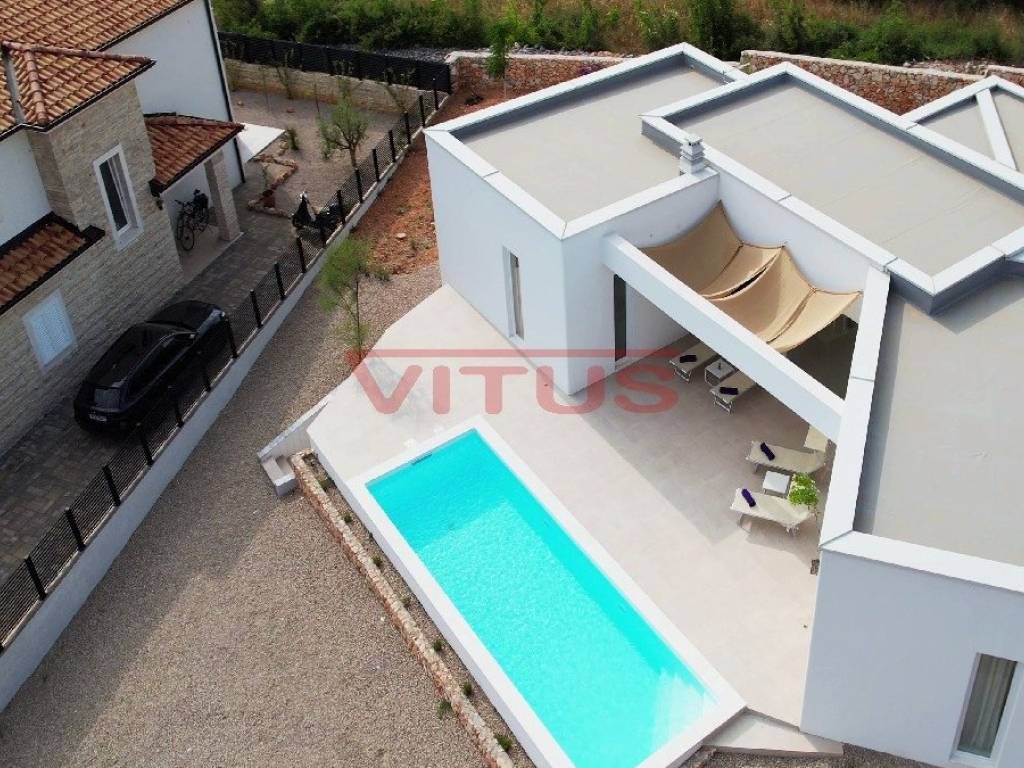 A modern, spacious detached house of 120 m2, on a 700 m2 plot with a 30 m2 swimming pool and a 58 m2 sundeck in the garden, is located in an attractive location, in a quiet area near the town of Krk, 1000 m from the sea. It consists of a living room, kitchen, dining room, hallway, three bedrooms with their own bathrooms, toilet, storage room and two covered terraces with a view of the sea, 32 m2 and 22 m2. Quality modern construction, equipped with air conditioning, underfloor heating, functional fireplace. It is sold fully furnished, and there are two parking spaces in the garden.