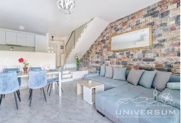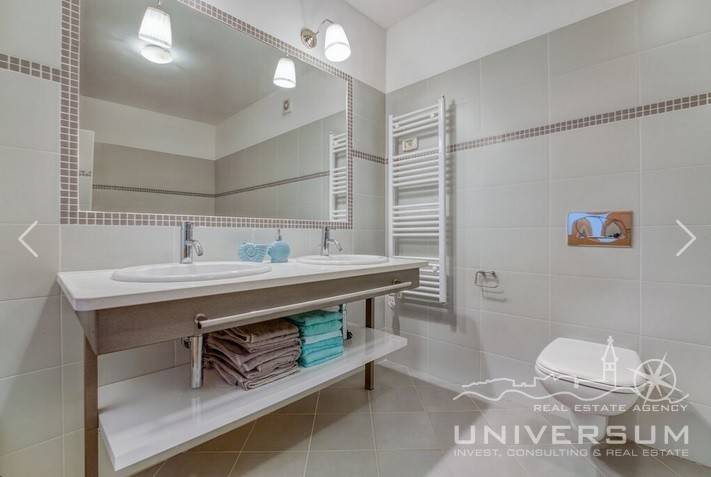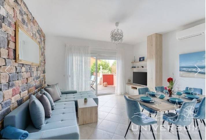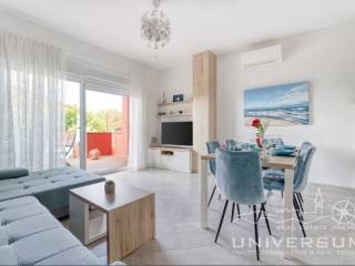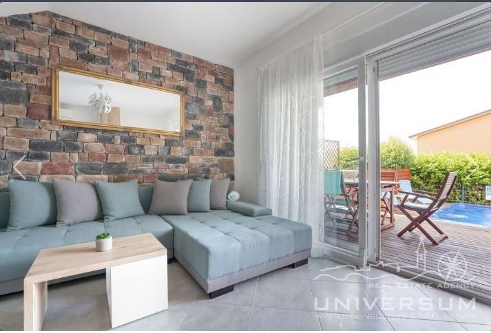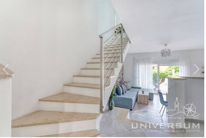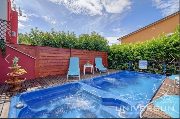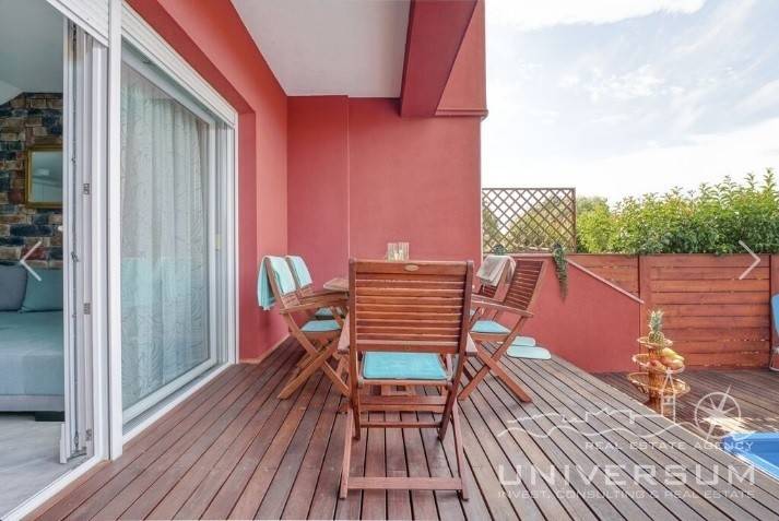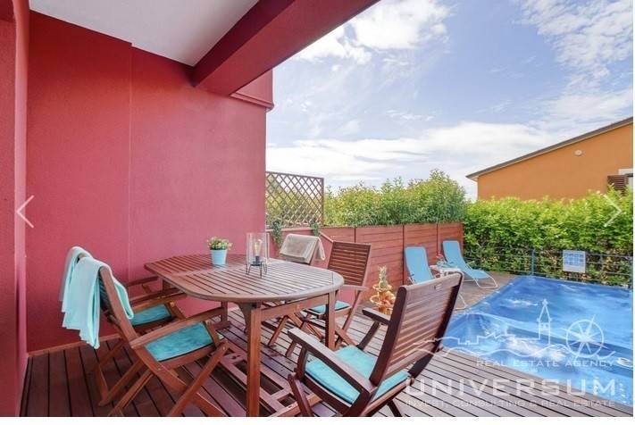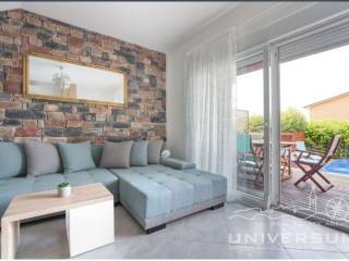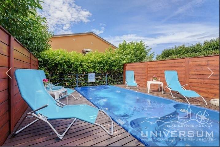 House in a row with pool for sale near Umag, located in a quiet location. The house area is 91.44 m2. The ground floor consist of a kitchen with dining area, living room and toilet. On the first floor is a bathroom and 2 bedrooms, one of which has access to the terrace. The garden has 66 m2 and has a small pool and jacuzzi and 2 parking spaces. The energy class of the house is A (poroterm block brick with demit facade) which guarantees low heating costs. It is equipped with first-class tiles and Italian sanitary, high-quality PVC six-chamber exterior carpentry with built-in aluminum shutters, Daikin air conditioners, satellite TV antenna, telephone line and internet. The house is for sale fully furnished and is categorized (4 stars) so that it can be rented for tourist purposes.