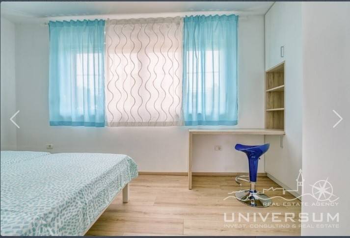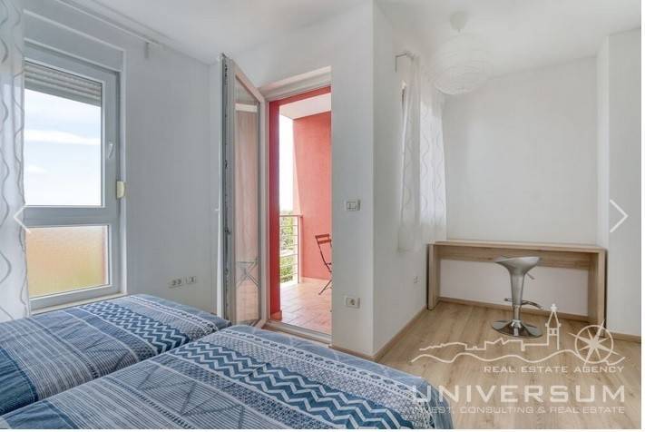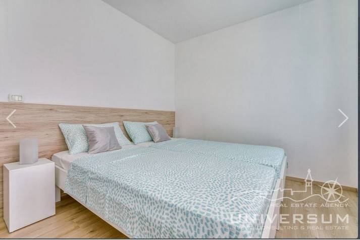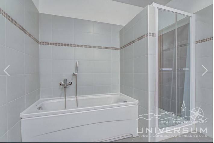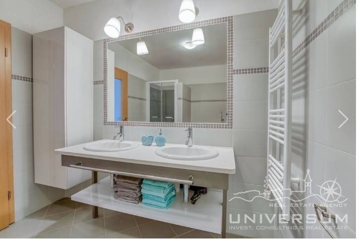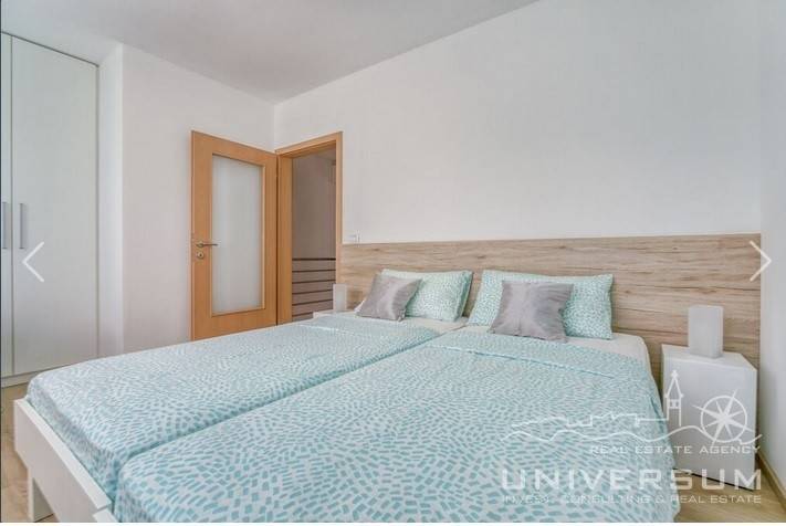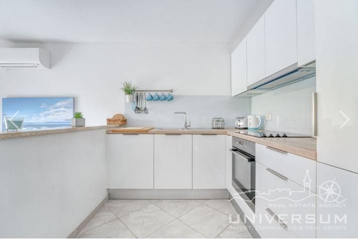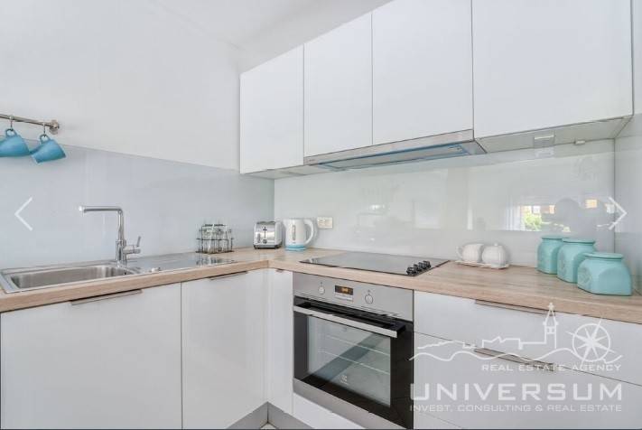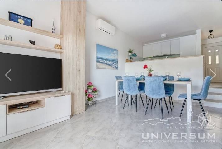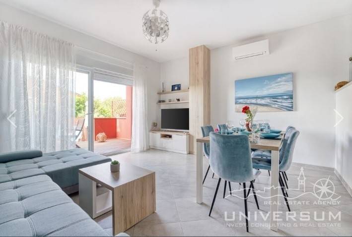 House in a row with pool for sale near Umag, located in a quiet location. The house area is 91.44 m2. The ground floor consist of a kitchen with dining area, living room and toilet. On the first floor is a bathroom and 2 bedrooms, one of which has access to the terrace. The garden has 66 m2 and has a small pool and jacuzzi and 2 parking spaces. The energy class of the house is A (poroterm block brick with demit facade) which guarantees low heating costs. It is equipped with first-class tiles and Italian sanitary, high-quality PVC six-chamber exterior carpentry with built-in aluminum shutters, Daikin air conditioners, satellite TV antenna, telephone line and internet. The house is for sale fully furnished and is categorized (4 stars) so that it can be rented for tourist purposes.