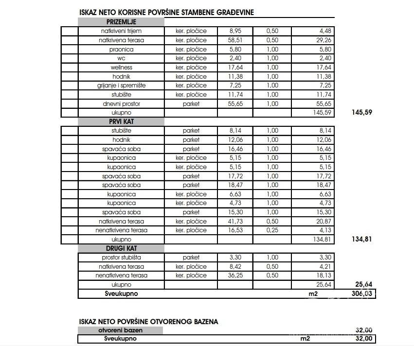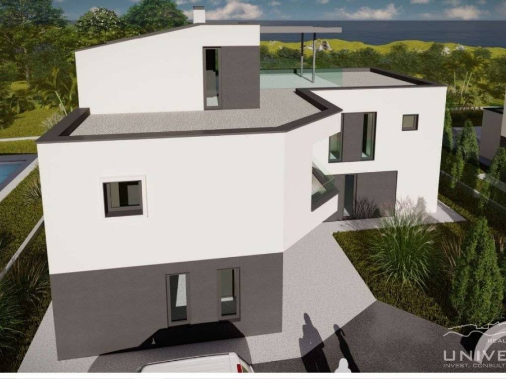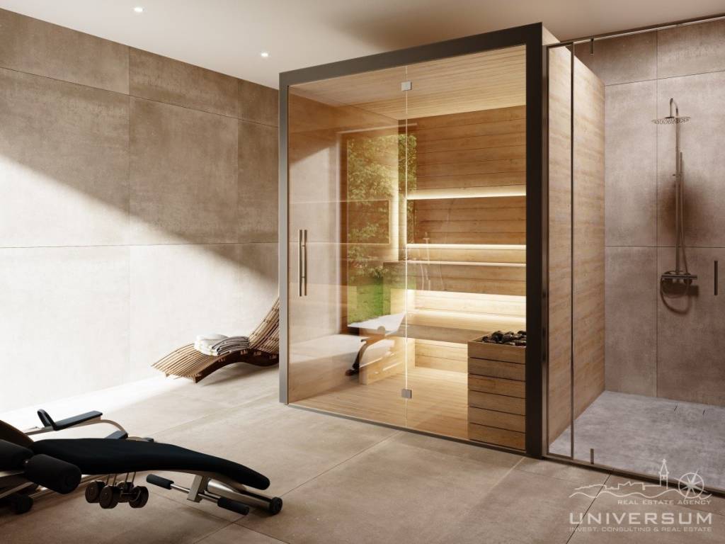 A beautiful modern villa for sale with a pool and a sea view in the vicinity of Poreč. The villa is located in a tourist town not far from Poreč with all amenities. The net usable area of the villa is 306 m2, while the land area is 772 m2. It extends over three floors. The ground floor of the villa consists of a large open space where there is a living room with a fireplace, a dining room and a kitchen. Also on the ground floor there is a toilet, a laundry room, a study and a wellness area with a sauna. The living room has direct access to a covered terrace of 29.25 m2, a swimming pool with a sunbathing area and a fenced plot.