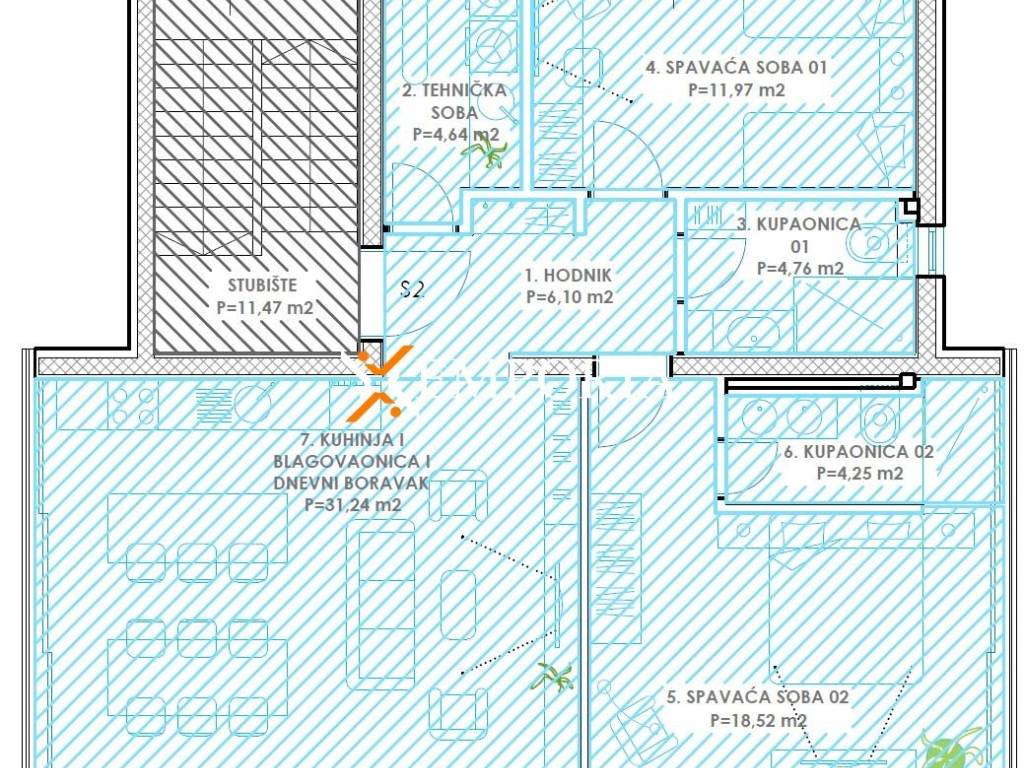 This is the only first floor apartment. The room layout consists of a hallway, a bedroom with a bathroom, a further bedroom, a bathroom, a laundry room, a kitchen with a dining and living room and a loggia. The surface of the described is 85,26 m2. The apartment also includes two outdoor parking spaces and a storage room in the basement.