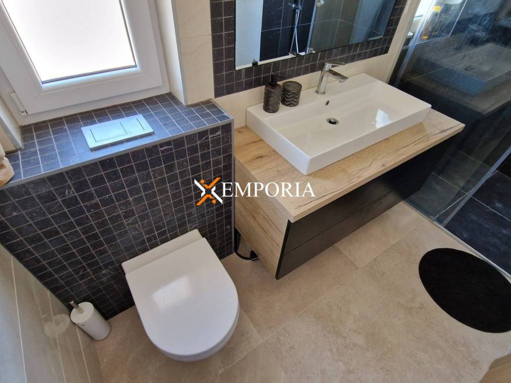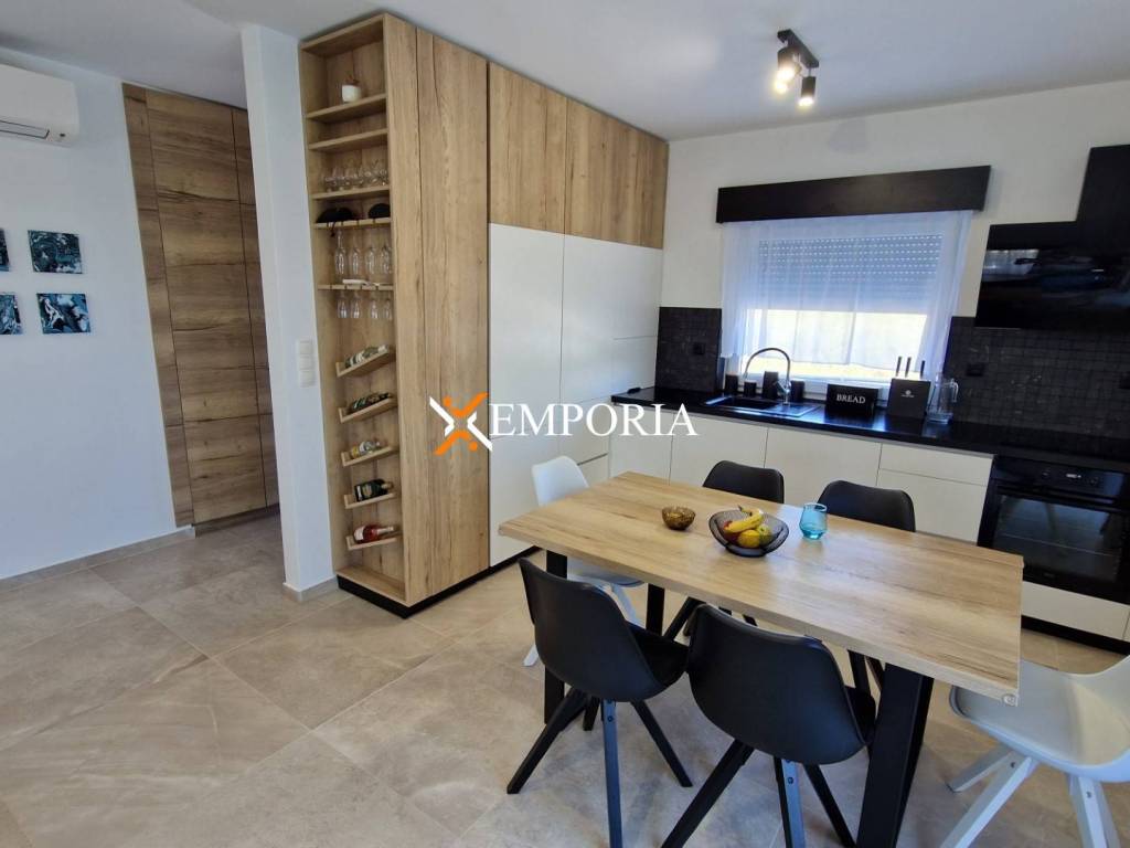 Construction with brick thermal blocks. Façade thermal insulation with 10 cm polystyrene. Floor coverings are tiles and laminate. The windows are made of PVC material with shutters and mosquito nets. There are 5 air conditioners in the house. There is a device in every room and living room. Underfloor heating is installed in the bathrooms, living room, kitchen and dining room. The front door of the house is burglar-resistant.