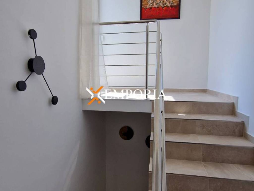 The villa consists of a ground floor and a first floor plus a roof terrace. The ground floor consists of a hallway, a bathroom, a kitchen with a dining room and a living room, a bedroom, a partially covered terrace, a storage room under the stairs and another storage room. The ground floor has an area of 90.83 m2. On the first floor you will find a hallway, two bedrooms, one en suite bedroom, one bathroom and a partially covered terrace. The upper floor has an area of 77.77 m2. In addition, the internal staircase leads to the roof terrace where there are preparations for a jacuzzi and a partially installed summer kitchen. The roof terrace with the associated staircase has an area of 85.85 m2.