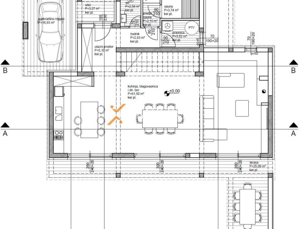 The area of the house is 234,23 m2. The land area is 765 m2. There is one covered and two uncovered parking spaces in the yard.