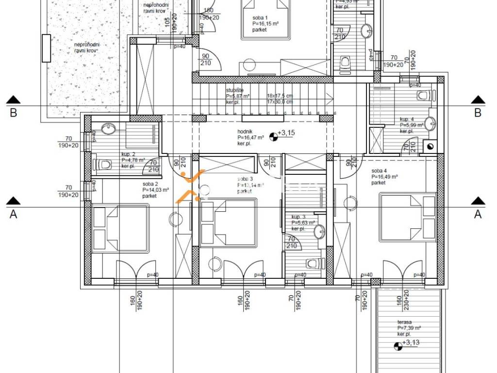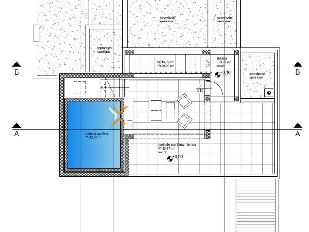 The layout of the rooms on the ground floor consists of a hallway, toilet, laundry room, sauna, kitchen with dining room and living room, terrace and internal stairs leading to the first floor. On the first floor there is a hallway, 4 bedrooms, each with its own bathroom, one of them has an exit to the terrace. Internal stairs lead further to the roof terrace, where a smaller swimming pool is located.