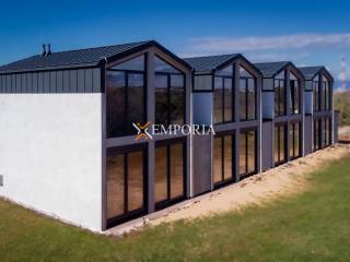A modern prefabricated house in a row is for sale. It is a high-quality new building in a modern resort in Zaton. The resort was designed in an innovative and minimalist style and consists of a total of 8 houses.