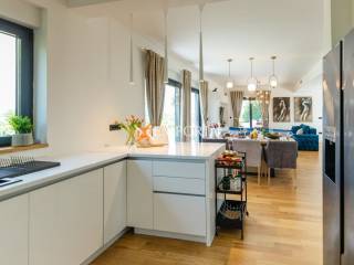 The floor coverings are parquet and tiles. The windows are made of aluminum with electric shutters, three-layer glass and mosquito nets. Underfloor heating is provided throughout the house via a heat pump. In addition, fan coilers are installed for heating and cooling the rooms, which also work via a heat pump. The front door of the house is burglar-proof.