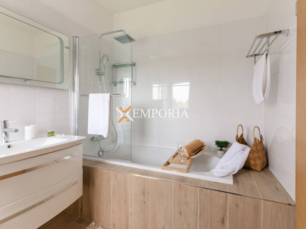 The layout of the rooms on the ground floor consists of a hallway, toilet, engine room, kitchen with dining room and living room, and a covered terrace. The internal stairs lead to the first floor, where there is a hallway, a bedroom with a wardrobe, a bathroom and a loggia, two bedrooms, a bathroom, a laundry room and a loggia. The total area of the house is 156,30 m2. In the yard there is a beautifully decorated tavern with an indoor grill and a bathroom, perfect for gatherings and celebrations. In addition, there is a spacious storage room by the pool.