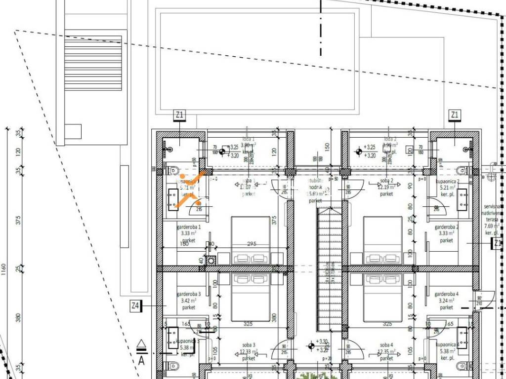 The house consists of a ground floor and a first floor. This is the south side of the semi-detached house. The ground floor consists of an entrance, a gym, an area with a sauna, a toilet, a laundry room, a kitchen with a dining room and a living room, two covered terraces and a summer kitchen with barbecue. Internal stairs lead to the first floor where there is a hallway, four bedrooms each with their own bathroom, dressing room and loggia. The area of the described premises is 272,06 m2.