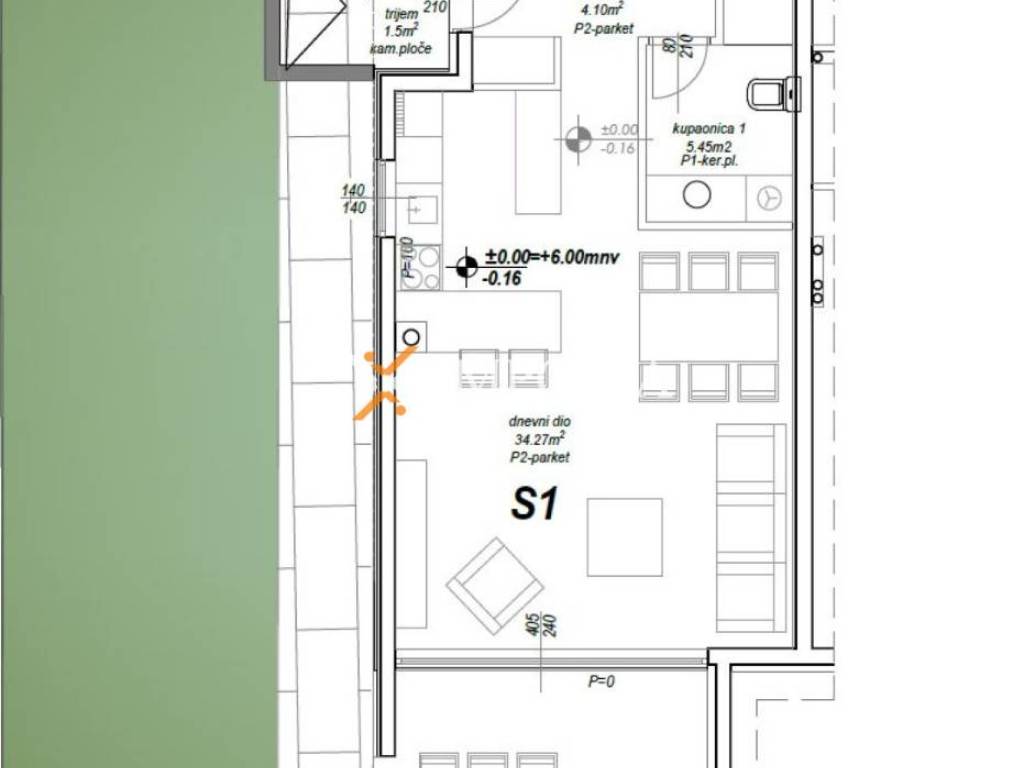 In addition, the apartment has a garden of 132,97 m2 and a parking space in front of the building. The total net area of the apartment with all additional parts is 100,09 m2.