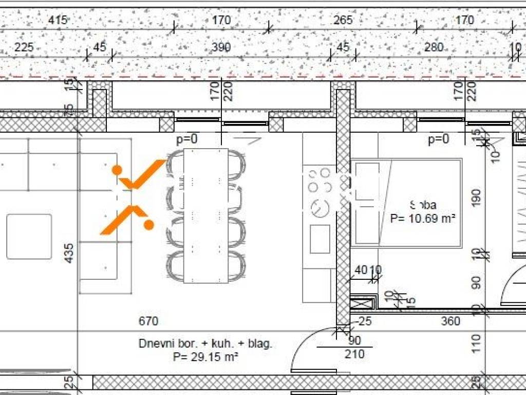 The building is constructed with concrete walls and partially with thermal bricks. A built-in outdoor barbecue is planned in the yard.