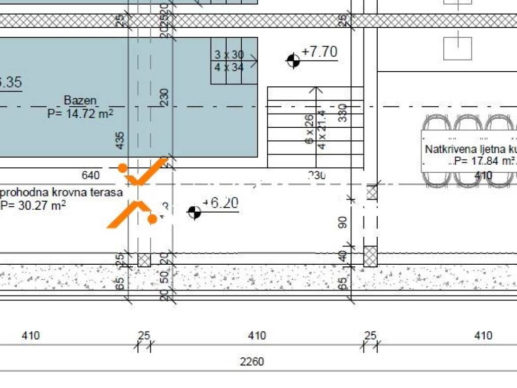 From the shared stairwell, you access a private rooftop terrace featuring a covered summer kitchen (17.84 m²) and a pool (14.72 m² gross / 7.36 m² net).