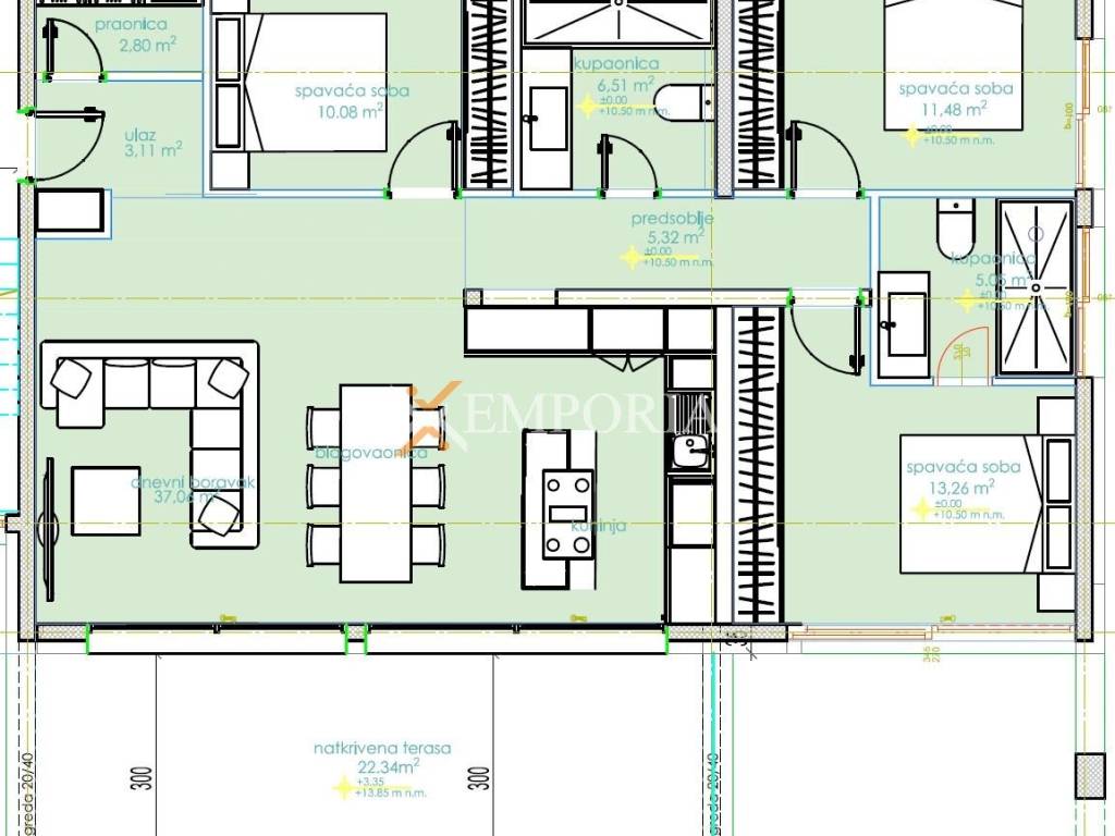 The net usable area of the apartment is 105.84 m², while the total net area including accessory parts amounts to 110.84 m².