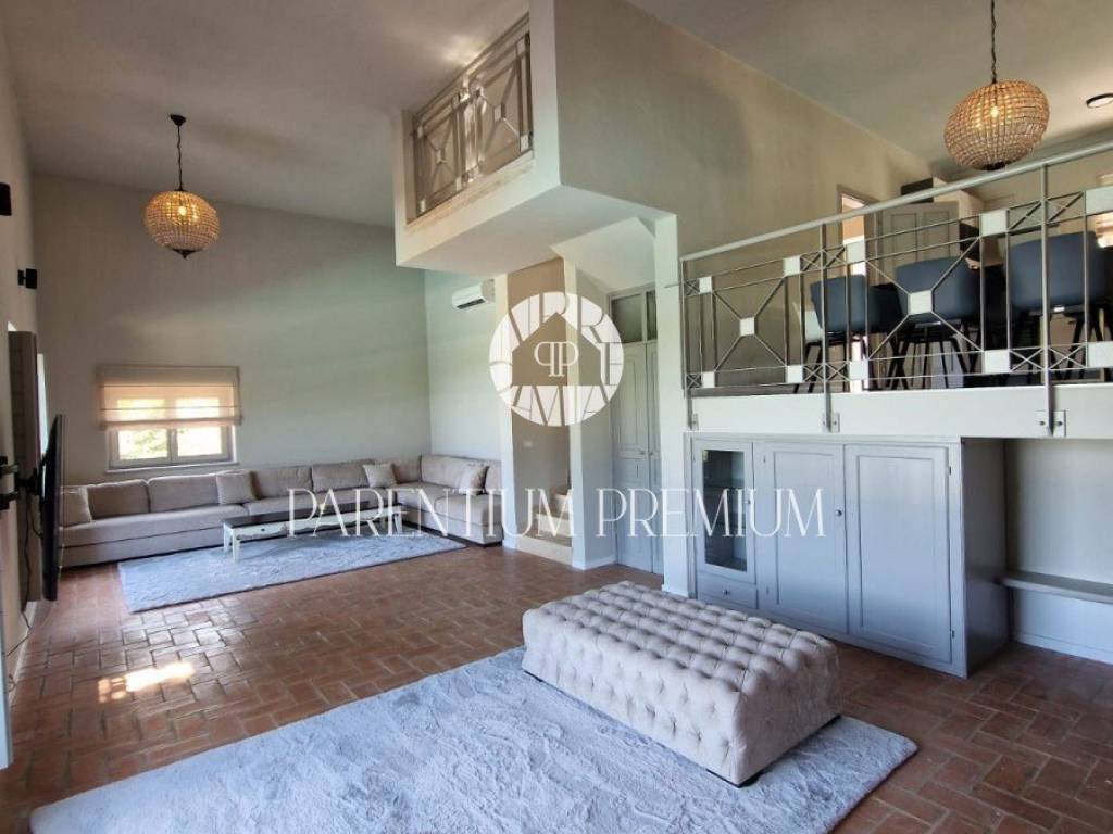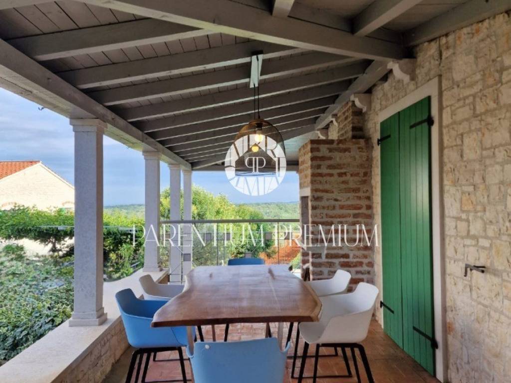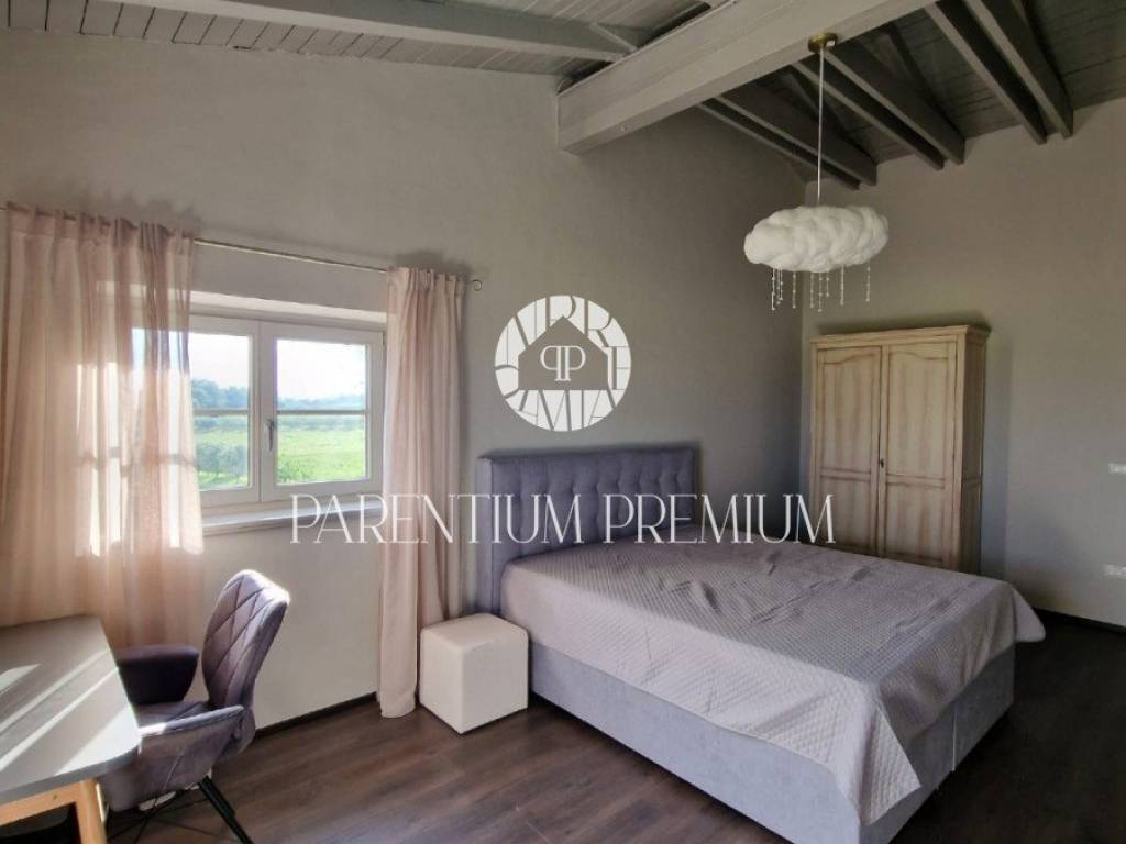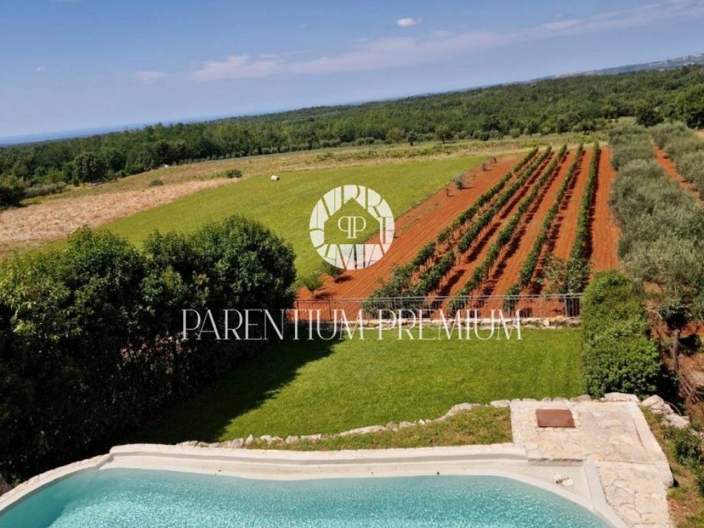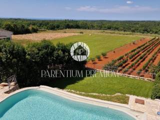 This beautiful rustic villa with a beautiful view of the sea and nature is located in a small Istrian village in the immediate vicinity of Poreč. The view is unobstructed because the villa is located on elevated ground and the land in front of it is not for construction, which guarantees great privacy for the future owner. The villa has an area of 185 m2 and is spread over a plot of 780 m2 and has a pool of 45 m2. It has three floors. Upon entering the villa, we come to a kitchen with a dining room, which opens onto a terrace with a wonderful view of nature and the sea. On the same floor there is a bedroom with a bathroom. We go down the stairs to the ground floor, where there is a living room with large windows that bring in a lot of light, from the living room there is the same courtyard. On the first floor there are four rooms and three bathrooms.