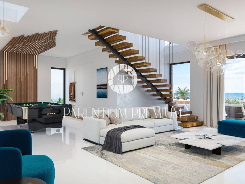 The property consists of a ground floor and an upper floor, with a total area of 306 m2, and covered terraces of the ground floor of 70 m2 and uncovered terraces of 82 m2, with a heated pool of 50 m2 and a fire pit of 10 m2. Four spacious bedrooms with en-suite bathrooms offer sea views, while the large living room opens onto the dining room, kitchen and billiards area.
