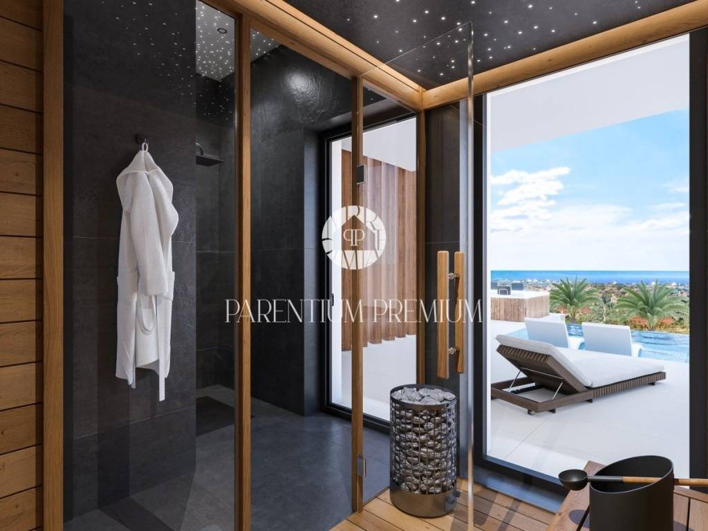 In the evening, the flash of flame reflects off the glass wall of the pool, creating an enchanting play of light. The villa offers additional luxurious pleasures such as an elegant sauna with a starry sky and an outdoor jacuzzi.