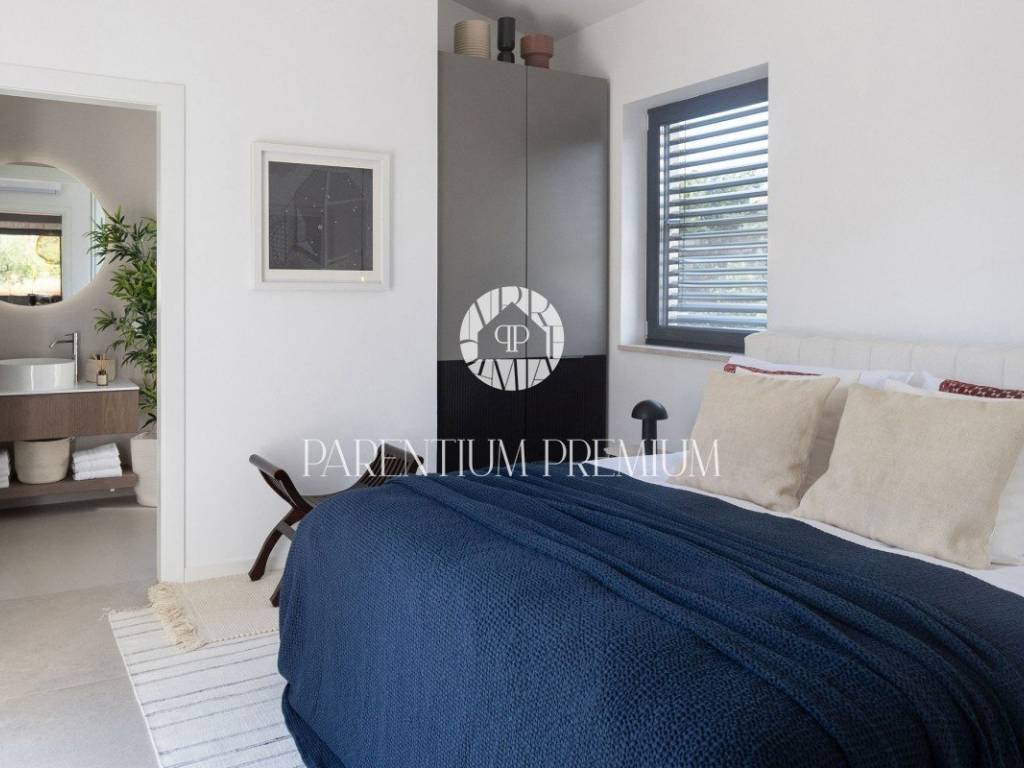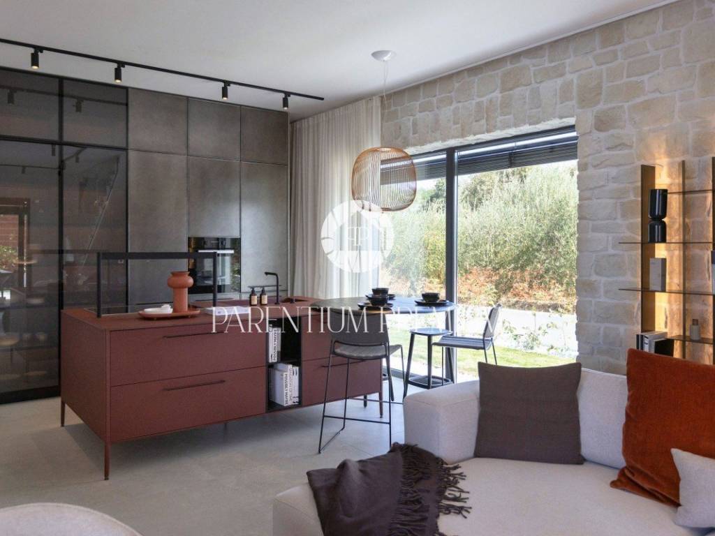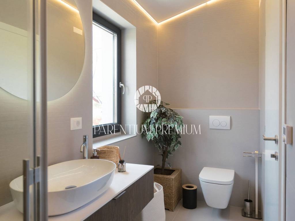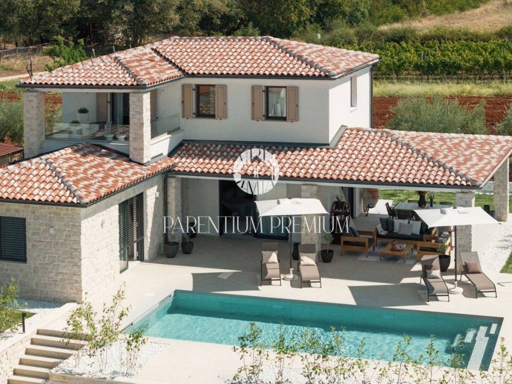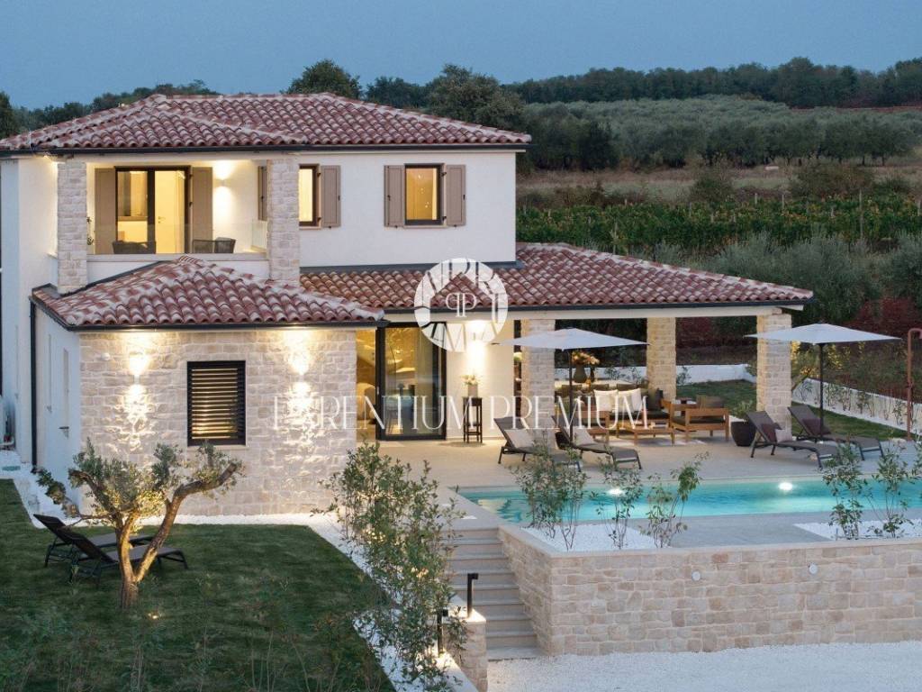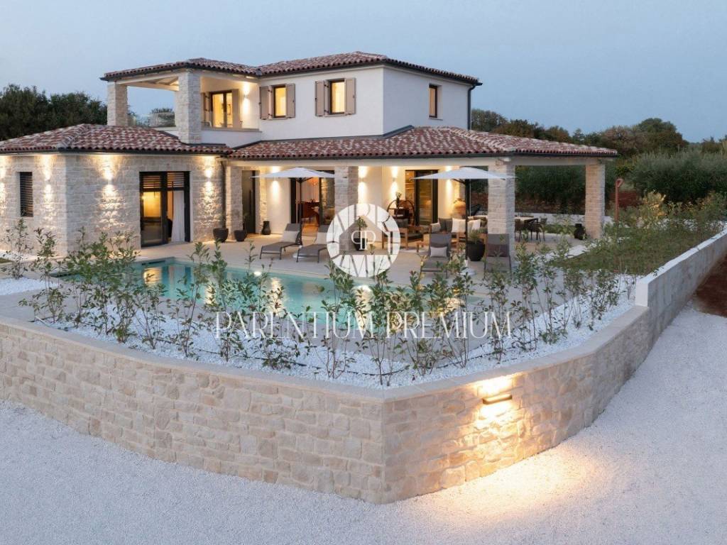 Only 5 km from the sea and the city is this beautifully furnished new stone villa with a total area of 165 m2 on a plot of land of 584 m2. The villa is spread over two floors, of which the ground floor consists of a spacious living room, kitchen, one bedroom with its own bathroom, a guest toilet and a technical room. On the first floor of the house there are two spacious bedrooms, each with its own bathroom and a balcony with a beautiful view of the sea. The villa is heated using a heat pump, underfloor heating is carried through both floors. In the yard there is a large sunbathing area, a swimming pool of 40 m2 and a summer kitchen. This property is sold fully furnished and offers the new owners an excellent solution for housing issues, but also a good investment for tourist purposes.