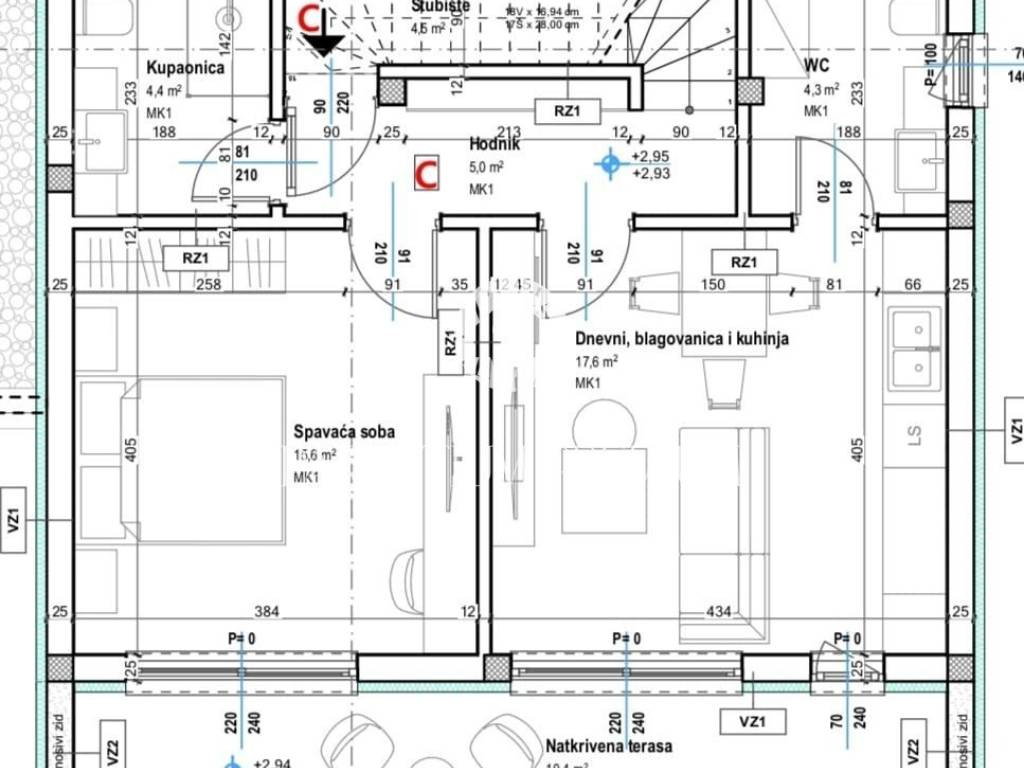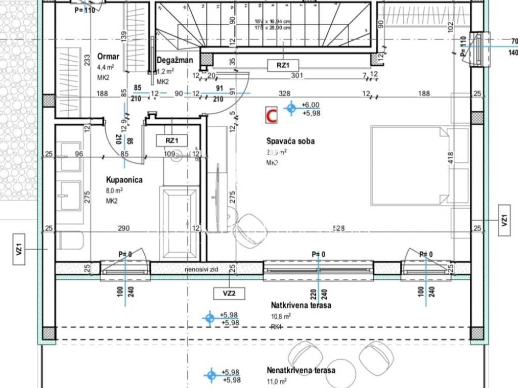On the last floor, we have a master bedroom with a bathroom and a dressing room, which opens onto a terrace with a truly enchanting and unobstructed view of the sea and the city of Poreč.