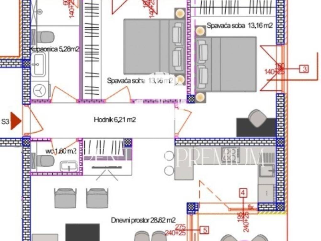 The apartment has a total area of 68.03m + 8.99m of terrace, and consists of a spacious living room with kitchen and dining room, two bedrooms, bathroom and additional toilet.
