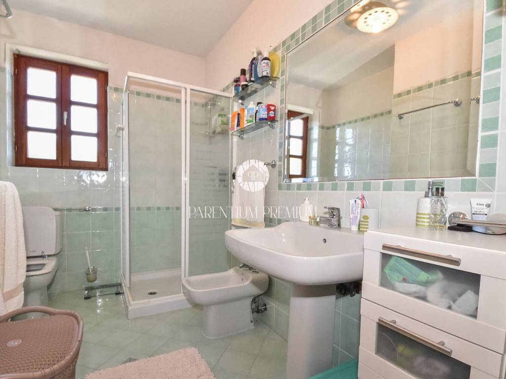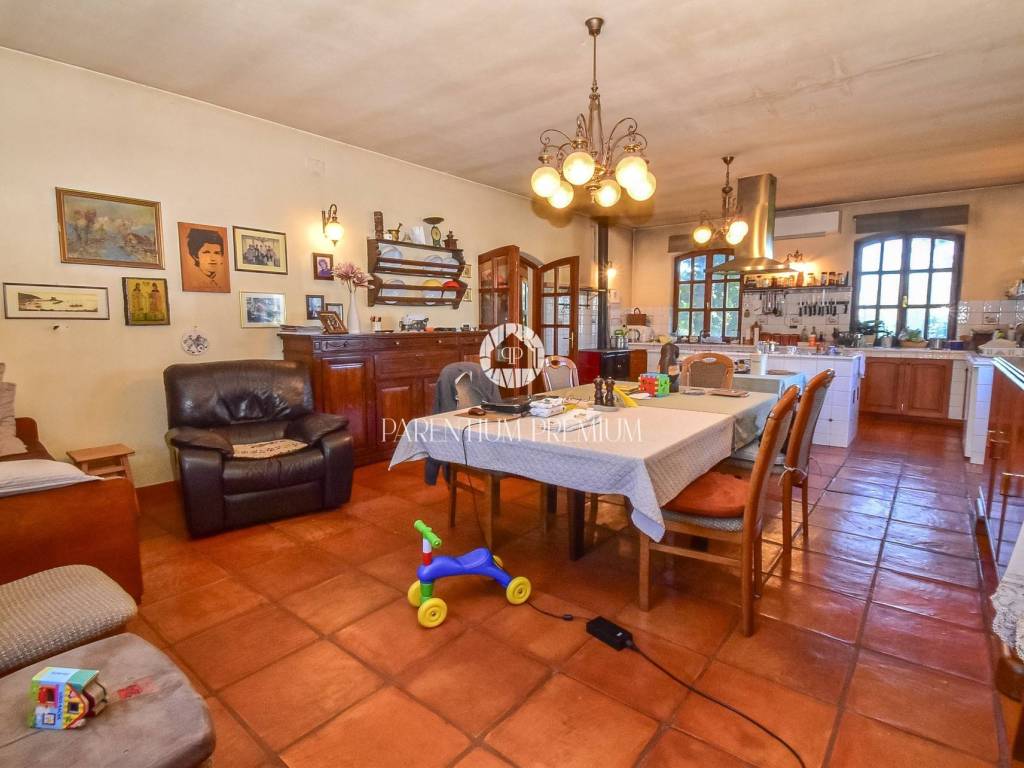 Ground floor: hallway, modern Italian-design kitchen with island and a large dining room perfect for family gatherings, and a spacious living room currently used as a bedroom. The rooms are bright and airy, with large glass surfaces overlooking olive groves and vineyards. There is also a guest bathroom with high-quality Italian ceramics.