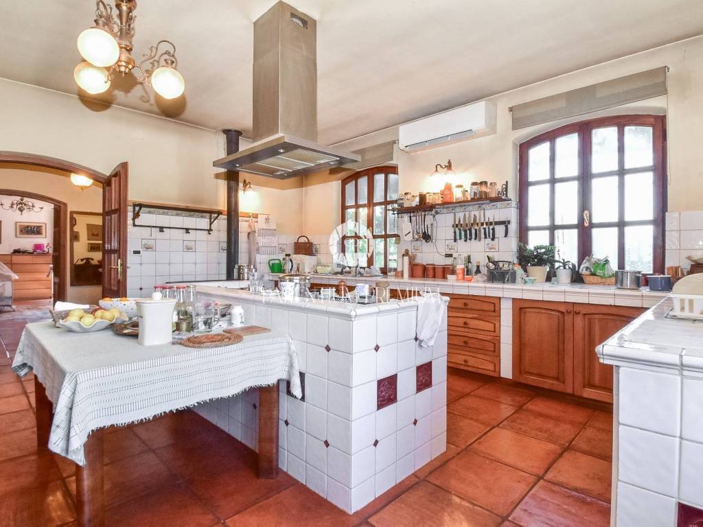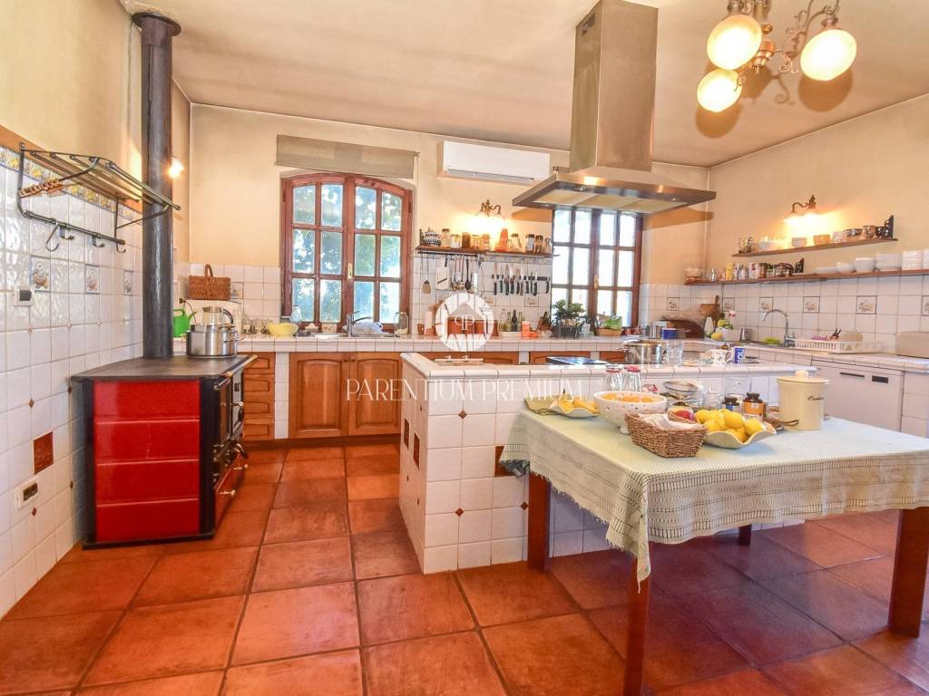 The estate consists of several interconnected plots with two access roads from asphalt streets. It features olive trees, vineyards, cherries, figs, and various fruit trees. There is also the option to build an additional guest house or auxiliary building.