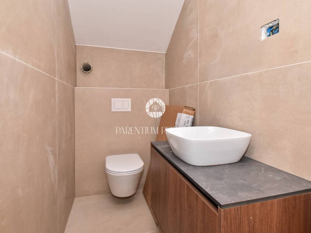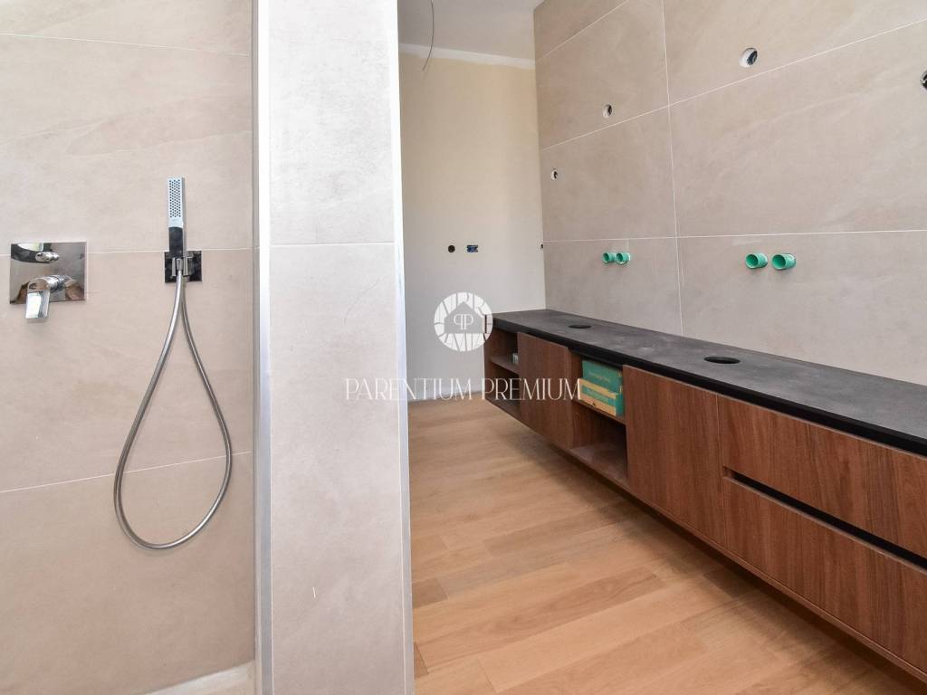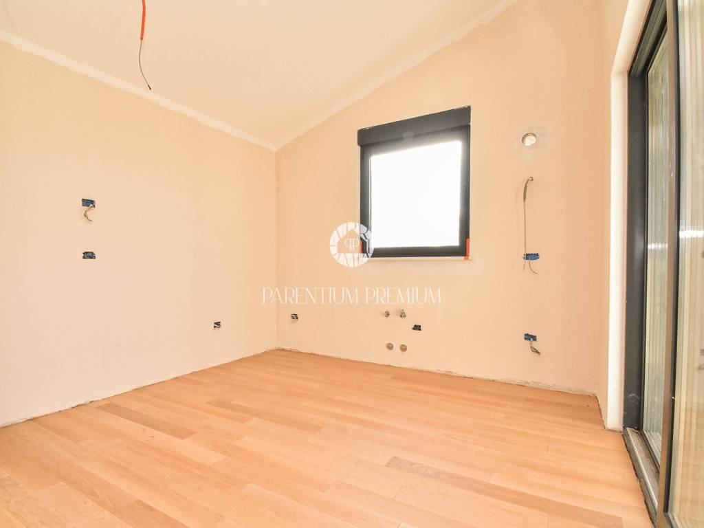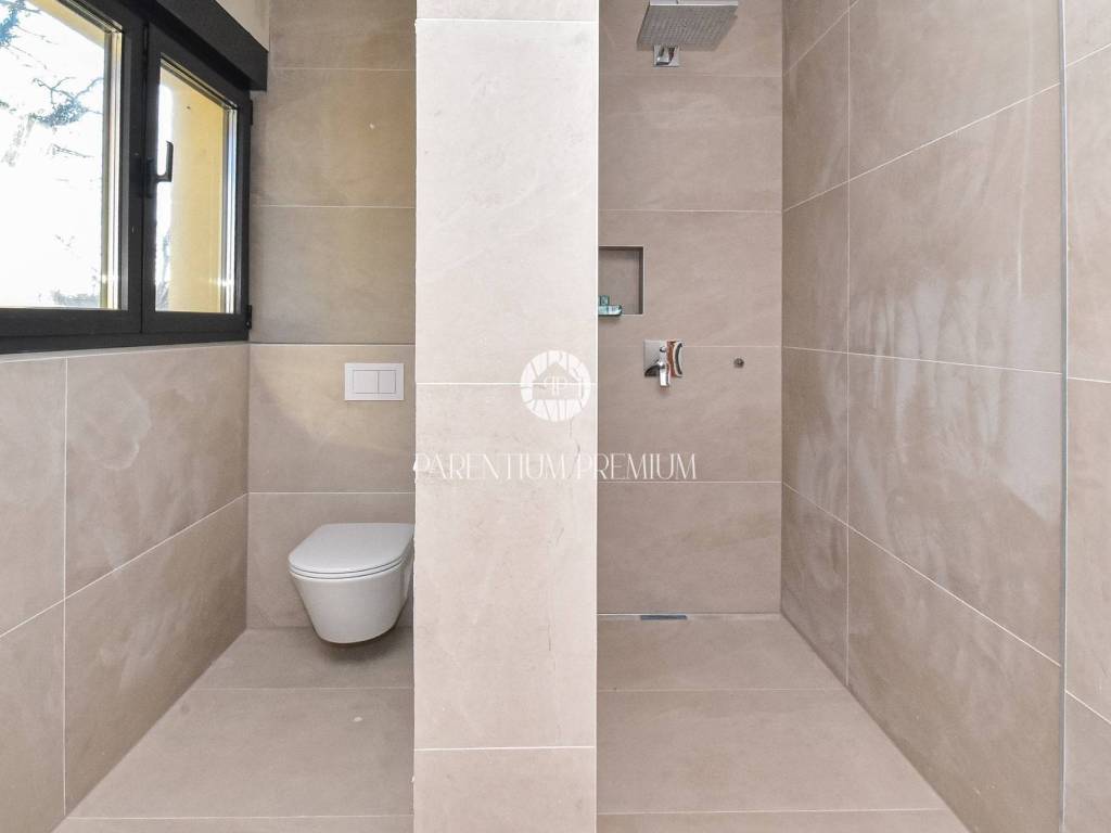 The upper floor features three comfortable bedrooms, each with its own bathroom and access to a terrace. An additional room is planned for a sauna or another facility according to the future owners wishes, enhancing both flexibility and luxury.
