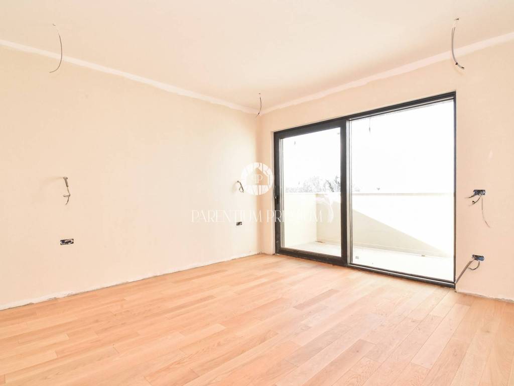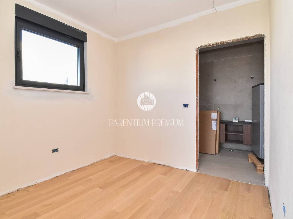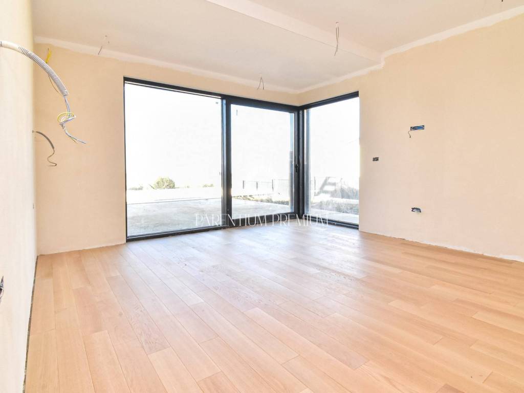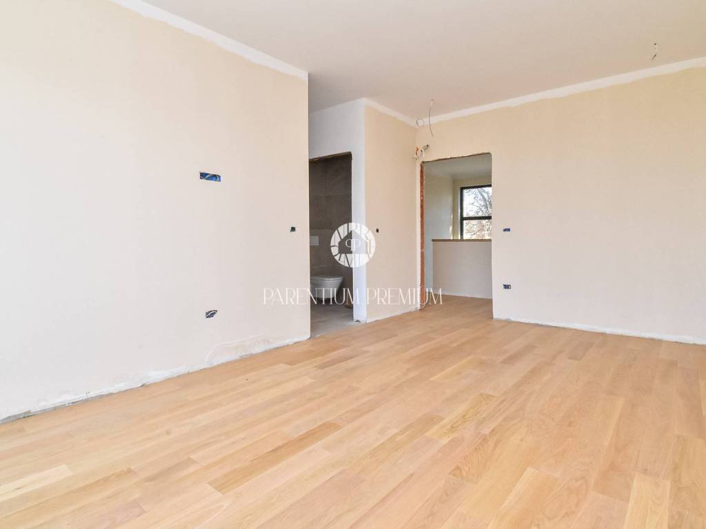 The upper floor features three comfortable bedrooms, each with its own bathroom and access to a terrace. An additional room is planned for a sauna or another facility according to the future owners wishes, enhancing both flexibility and luxury.
