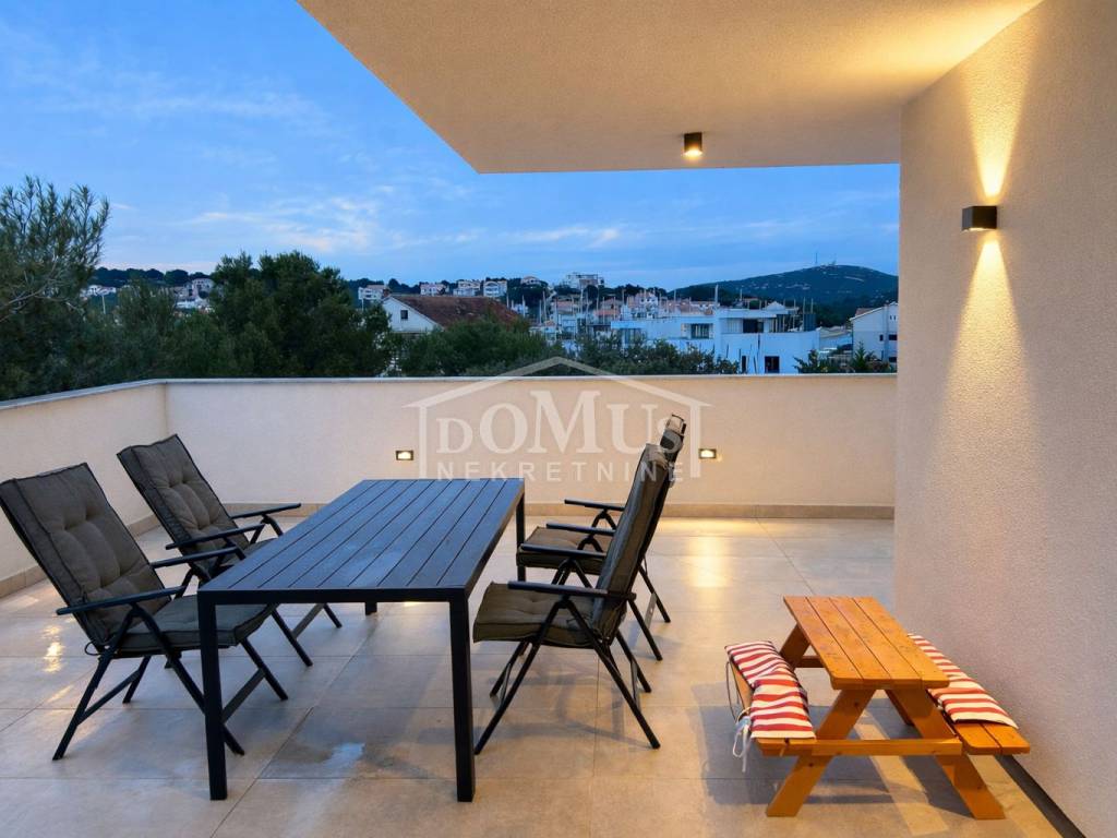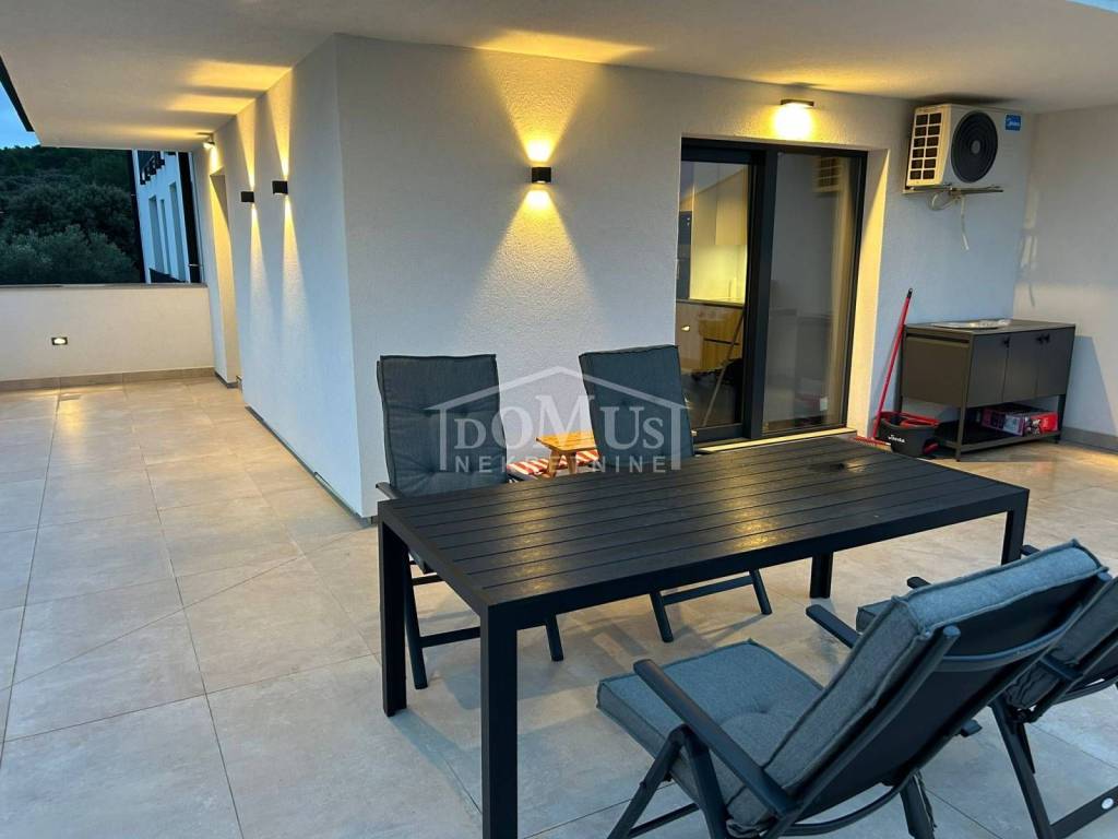 In Jezera, a spacious apartment with a total area of 113.90 m² is for sale, located in a high-quality, well-constructed and condominiumized building that was formerly part of a hotel complex. The apartment is situated on the first floor and consists of an entrance hall, a bathroom, a spacious living room with kitchen and dining area, and two bedrooms. A special advantage of this property are two exceptionally large outdoor areas – a covered terrace of 35.7 m² and an uncovered terrace of 35.4 m², ideal for relaxing and enjoying the Mediterranean surroundings. The apartment is equipped with high-end and luxurious materials, custom-made furniture, high-quality ceramics, and underfloor heating installed throughout the entire apartment. The kitchen is fully and modernly equipped. The property is sold with all existing furniture and equipment. It is located in a quiet environment, only 250 m from the beach and all amenities of the town of Jezera.