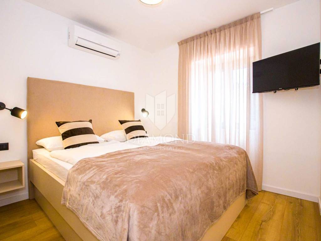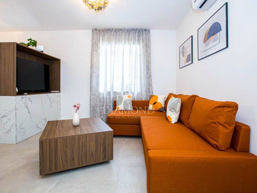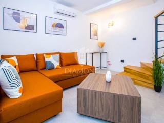 The main building is a renovated house spread across ground floor and first floor, with a total area of approximately 110 m². The ground floor features a kitchen, living room and a guest toilet, while the first floor offers two bedrooms and a bathroom. Underfloor heating runs throughout the entire house, and air-conditioning units provide cooling. The house is finished and furnished, meaning it is ready to move into or immediately ready for rental with no additional investment.