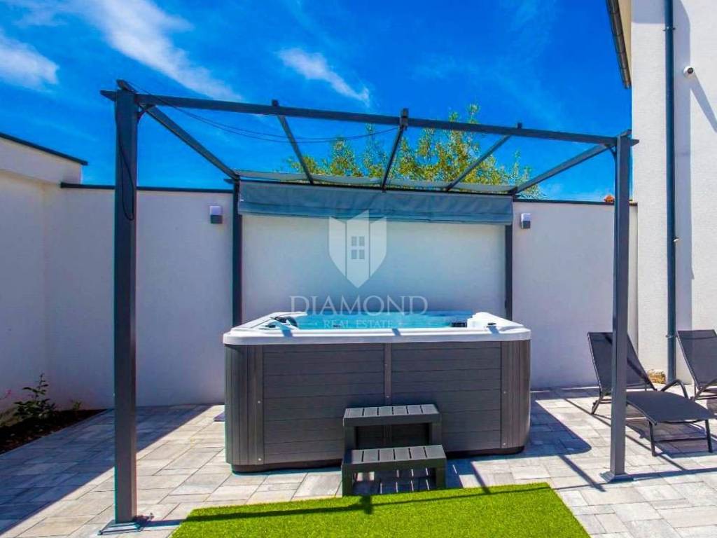 The yard is already paved and arranged to be both easy to maintain and pleasant to enjoy. It includes a jacuzzi, perfect for relaxation throughout the season, and the installations have been set up in a way that can serve as a strong base should you decide to build a swimming pool in the future.