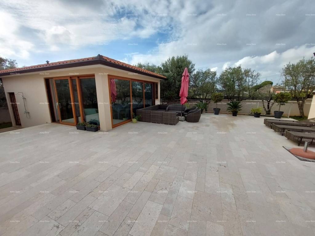 Продается красивый дом в Водняне с двумя квартирами и крытым бассейном. Площадь земли, на которой построен дом, составляет 1683 м2. Дом состоит из подвала, цокольного этажа и первого этажа. Дом 489м2. На первом этаже две квартиры, каждая квартира имеет отдельный вход. Первая квартира двухэтажная, а на первом этаже столовая, кухня с гостиной и столовой, гардеробная и гостевой туалет. На второй этаж можно попасть по внутренней лестнице, ведущей на второй этаж дома, где расположены три спальни с отдельными ванными комнатами. Также со второго этажа есть выход на просторную террасу, частично крытую и частично открытую. Квартира, расположенная на первом этаже, занимает один этаж и имеет площадь 43 м2. Одноэтажная квартира состоит из гостиной с кухней, столовой, спальни и одной ванной комнаты. Крытый бассейн размером 18 м2 или 6x3. В доме также есть две большие закрытые террасы и современная летняя кухня. Дом расположен в аккуратном закрытом саду. Кондиционеры есть в каждой комнате, дом полностью кондиционирован. Дом продается полностью меблированным. Дом расположен в нескольких сотнях метров от главной дороги города, магазинов и всех важных объектов, но опять же в тихой части Водняна, где нет слишком большого движения. Дом расположен в 6 минутах езды на машине от первого пляжа и в 12 минутах от Пулы. Дом может быть использован для туризма и сдачи в аренду и подходит для приятного и длительного проживания.
