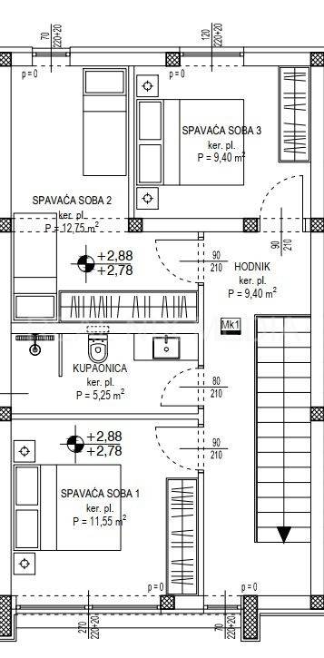 S2 - prizemlje sačinjava natkriveni ulaz, hodnik, kupaonica, vešeraj, kuhinja, blagovaonica i dnevni boravak sa izlazom na VRT (cca. 33,00 m2). Unutarnje stubište vodi na kat kuće gdje se nalaze tri spavaće sobe i kupaonica. U dvorištu kuće nalaze se dva vanjska parkirna mjesta. Cijena: 360.728,00 EUR-a.