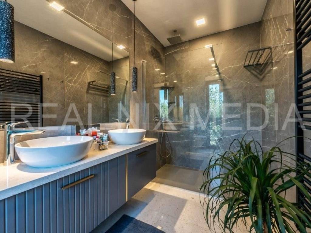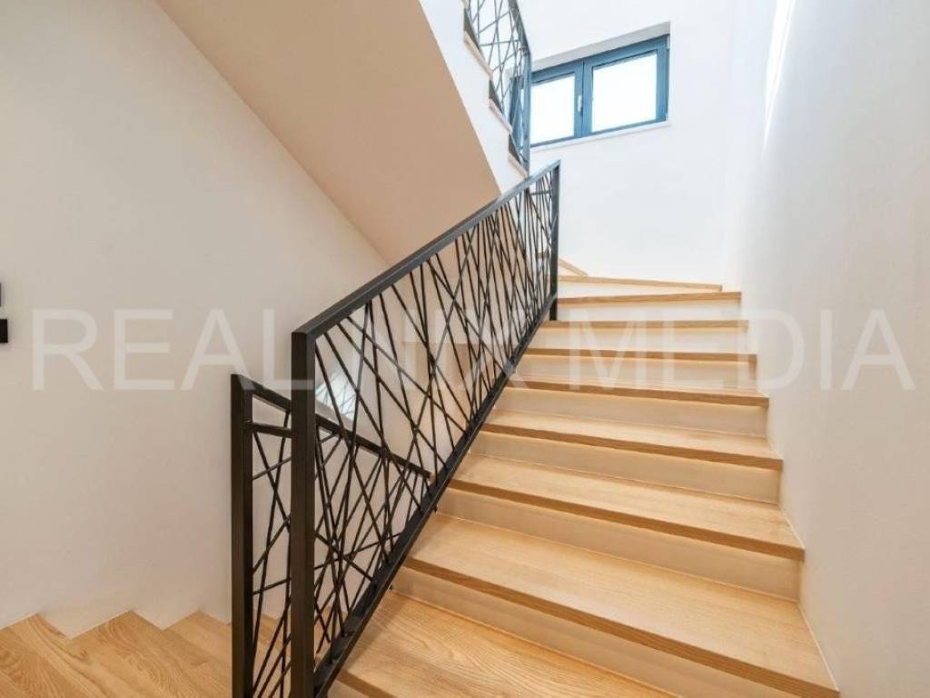 Predivno stepenište s rukohvatima jedinstvenog dizajna, vodi na prvi kat na kojem se nalaze 4 prostrane spavaće sobe, svaka sa svojom kupaonicom. Sobe su opremljene dizajnerskim namještajem te uređene kako bi zadovoljile i najzahtjevnije kriterije kvalitete i dizajna.