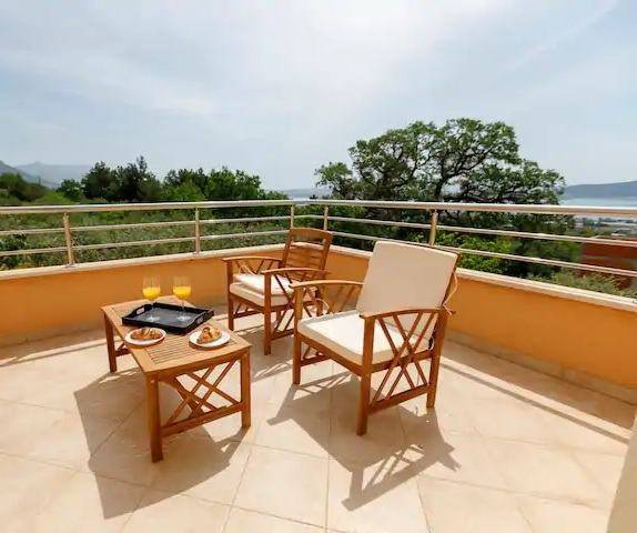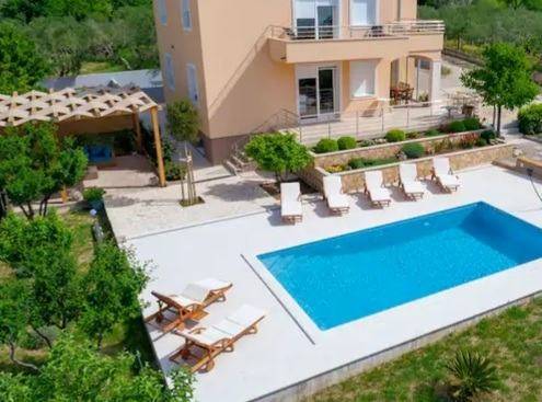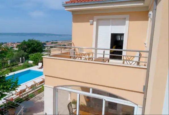 Ekskluzivno posredujemo pri prodaji predivne vile u Kaštel Sućurcu. Smještena je dvjestotinjak metara iznad magistrale, izgrađena na parceli od 1000 m2. Sastoji se od suterena, gdje je smještena konoba, prostorija s biljarom, vinski podrum, wc,te dvije sobe koje služe kao pomoćne prostorije. U suterenu se po želji može urediti komforan dvosoban stan. U prizemlju je lijepi dvosoban stan, s hodnikom, kupatilom, malim wc-om, dvije spavaće sobe, kuhinja, trpezarija i veliki dnevni boravak, s izlazom na terasu i istočnu lođu, te na bazen. Na katu je isti takav stan modernijeg uređenja, s dvije terase. Stanovi imaju po dvije klime koje pokrivaju cijeli prostor, podno grijanje u kupatilima i kuhinji. U cijeloj kući je provučeno i predviđeno centralno grijanje. Na kući su solarni paneli. Grijani bazen s masažom ima 32 m2. Okućnica je lijepo i sadržajno uređena, ima igralište za stolni tenis i mali nogomet, igralište za djecu, roštilj, sjenicu za odmor u hladu. Za parkiranje automobila je predviđena jedna zatvorena garaža, nekoliko natkrivenih parkirnih mjesta, i nekoliko nenatkrivenih. U kuću nisu potrebna ulaganja, sve je novo i održavano.Nema buke prometa, i ima dovoljno privatnosti za ugodno stanovanje ili odmor. Iz kuće se pruža predivan otvoreni pogled na more, susjedstvo mirno. Trenutno se iznajmljuje na tjednoj bazi , i ima goste od svibnjado kraja listopada. Recenzije gostiju su fantastične, ocjena na bookingu 10. Kuća i ugođaj su mnogo ljepši nego što slike kazuju. Vlasništvo uredno.