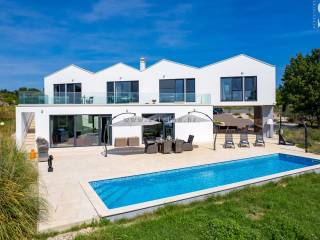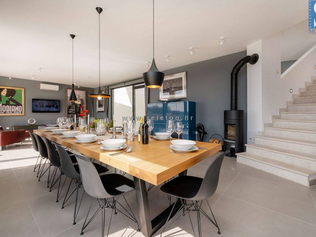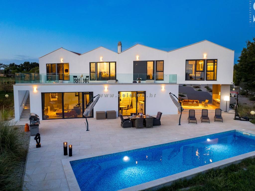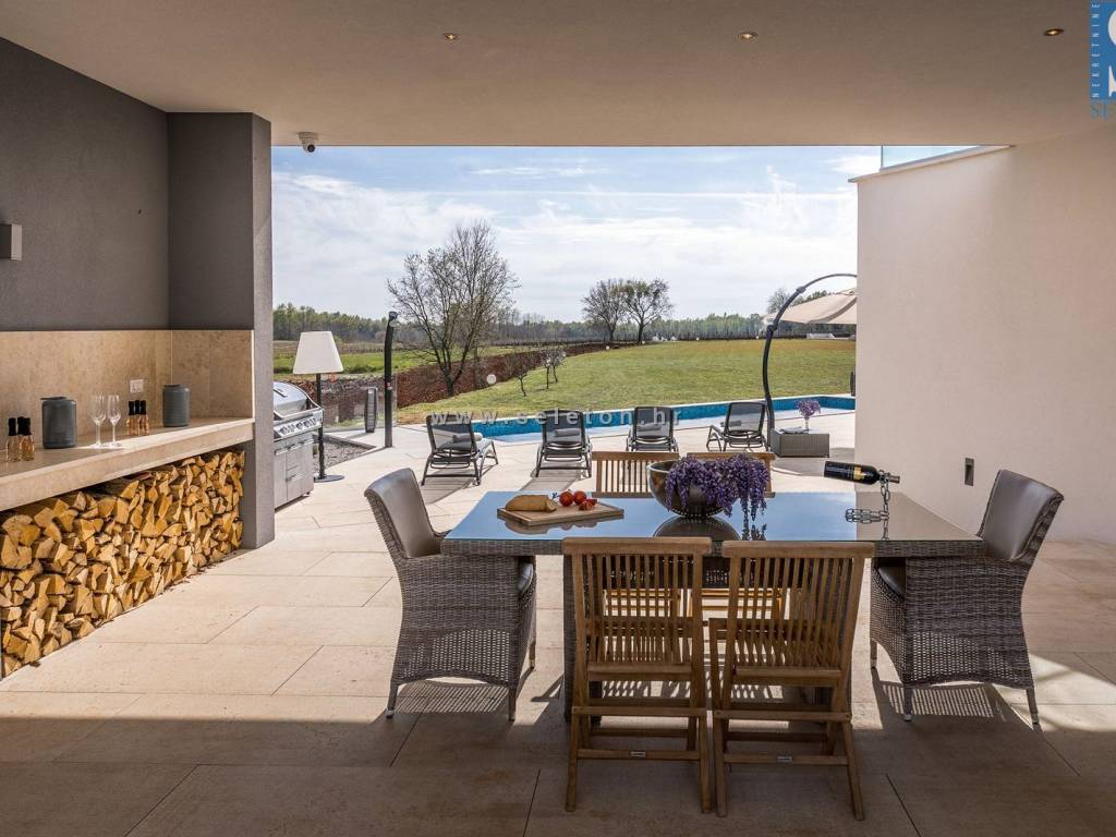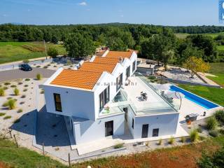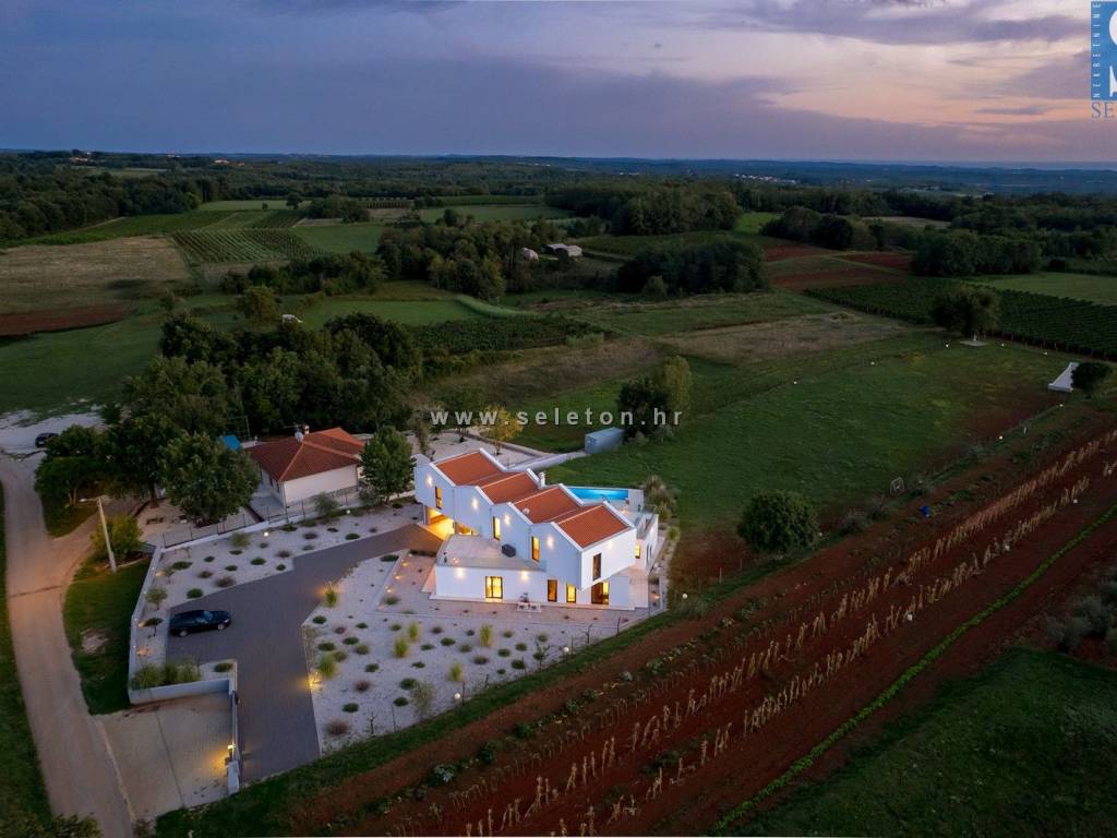 In a quiet village near Poreč, a modern villa with a swimming pool is for sale. The villa consists of a spacious living room, kitchen, dining room, hallway, two bedrooms with bathrooms, a large terrace, storage room, boiler room/laundry room, pool storage room and two guest toilets on the ground floor, and a hallway, four bedrooms with bathrooms and a large terrace on the first floor. The house has an area of ​​437 m², was built in 2020 on a plot of land with a total area of ​​6,271 m² (construction area is 2,008 m², agricultural area is 4,263 m²), is sold fully furnished, has underfloor heating, air conditioning in all rooms, alarm, video surveillance, a 36 m² swimming pool, 6 parking spaces and a bocce court. The house is located on the edge of a small village approximately 15 km from Poreč and the sea.