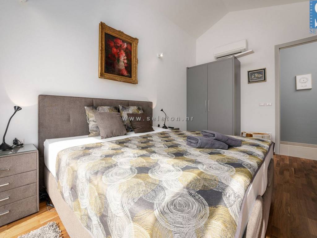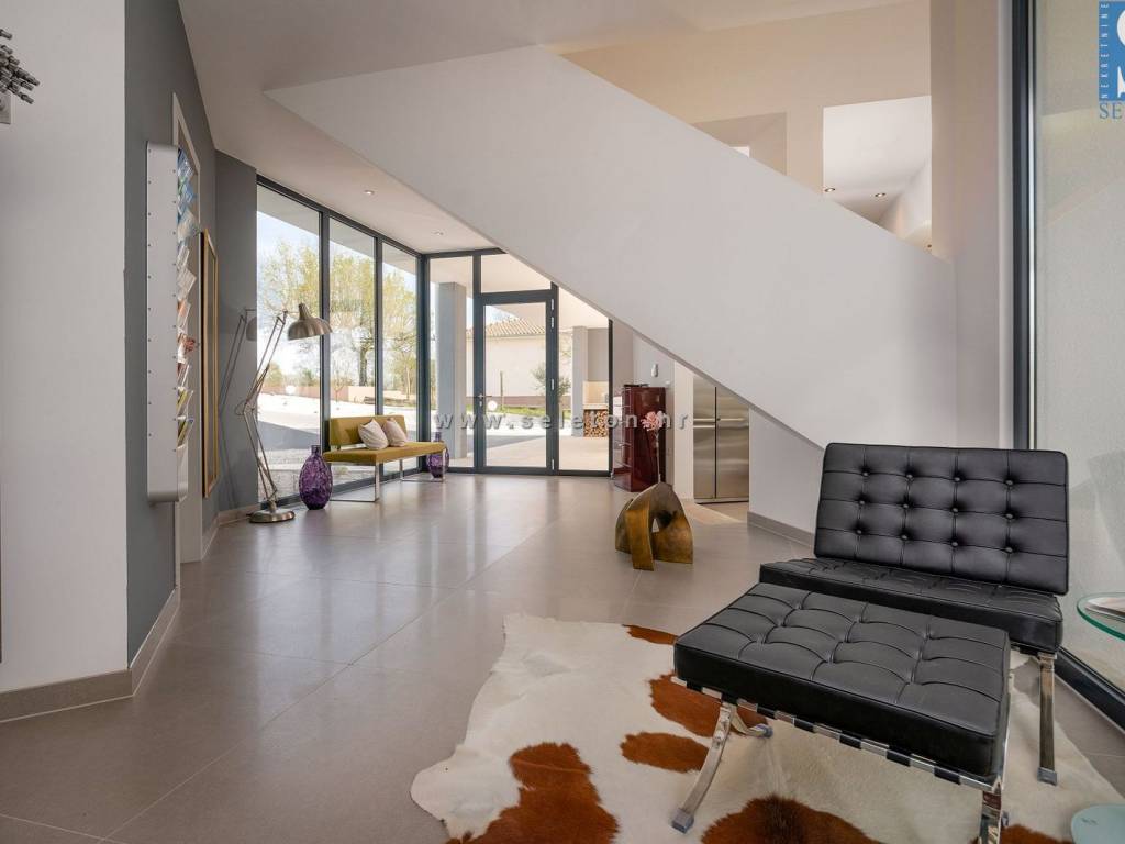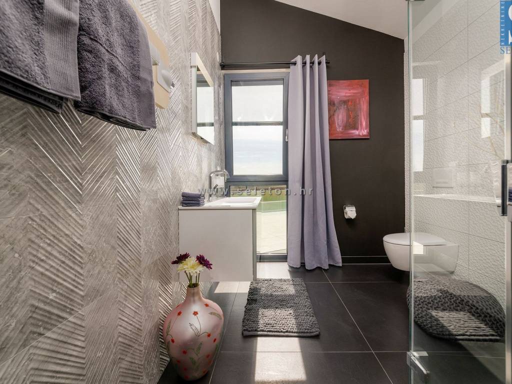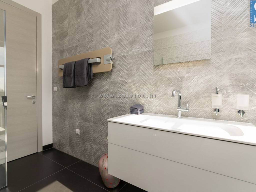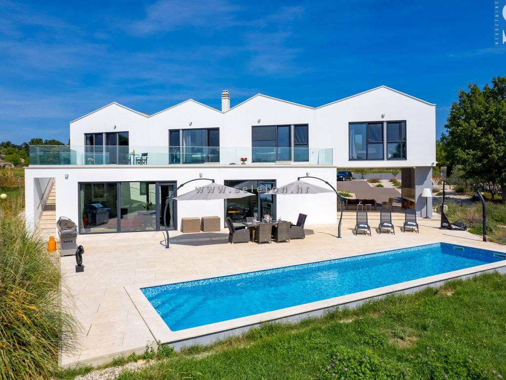 In a quiet village near Poreč, a modern villa with a swimming pool is for sale. The villa consists of a spacious living room, kitchen, dining room, hallway, two bedrooms with bathrooms, a large terrace, storage room, boiler room/laundry room, pool storage room and two guest toilets on the ground floor, and a hallway, four bedrooms with bathrooms and a large terrace on the first floor. The house has an area of ​​437 m², was built in 2020 on a plot of land with a total area of ​​6,271 m² (construction area is 2,008 m², agricultural area is 4,263 m²), is sold fully furnished, has underfloor heating, air conditioning in all rooms, alarm, video surveillance, a 36 m² swimming pool, 6 parking spaces and a bocce court. The house is located on the edge of a small village approximately 15 km from Poreč and the sea.
