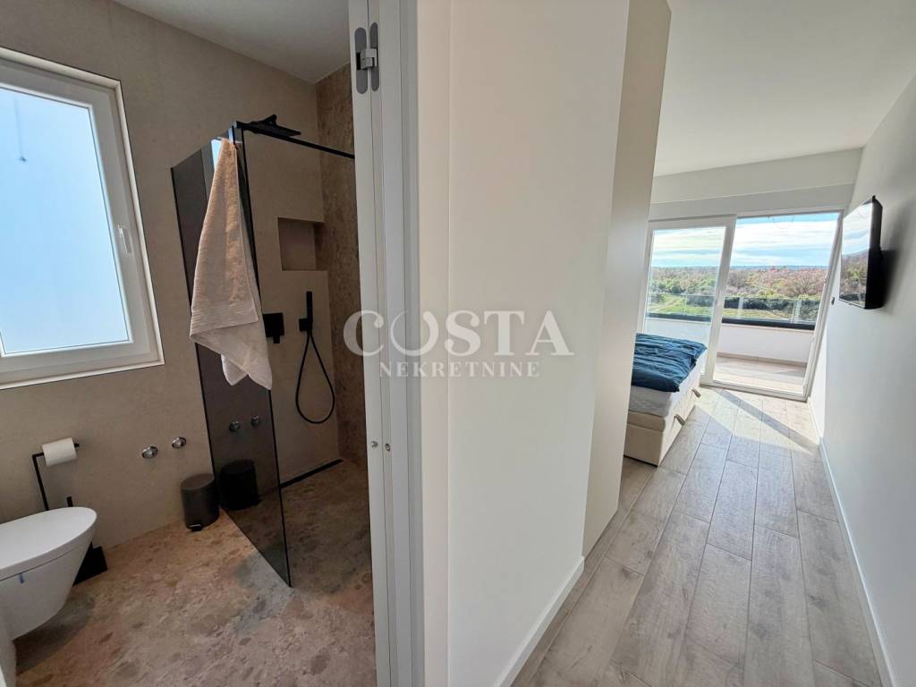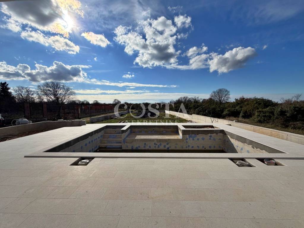A villa with a swimming pool for sale in an extremely isolated location in Briševo near Zadar. The building with an area of 179 m2 was built on a plot of 1255 m2. It consists of a ground floor and a first floor. On the ground floor there is a living room, kitchen and dining room, pantry, laundry room and additional toilet. On the first floor there are three bedrooms with attached bathrooms and a terrace. The living room leads to a covered terrace and a garden with a swimming pool.