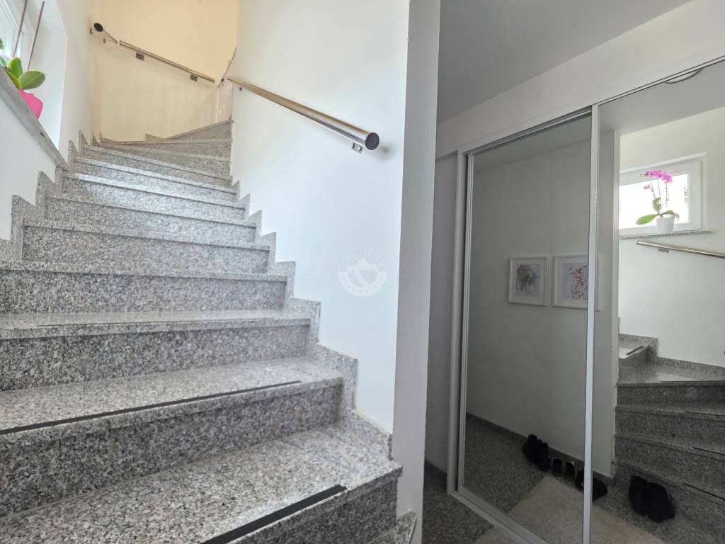 For sale is a comfortable duplex apartment with a net floor area of 64.25 m2, located in a smaller residential building with a total of two floors. The apartment occupies the first and second floors, with the first floor serving as an entrance hallway with access to stairs leading to the main living area on the second floor.