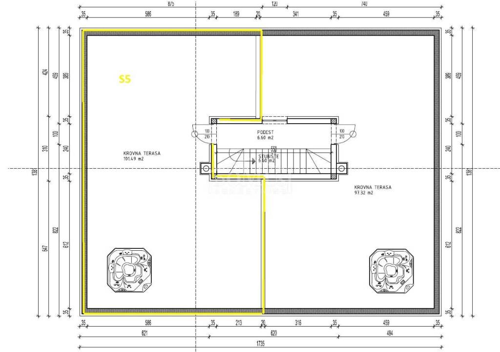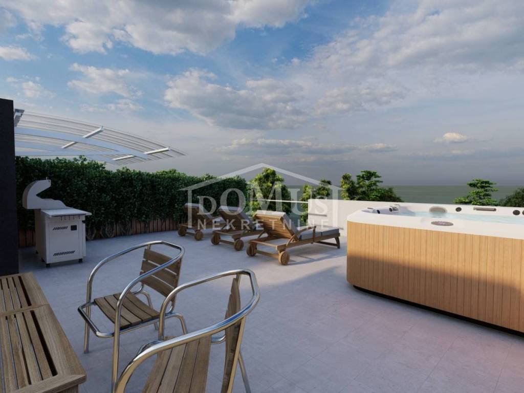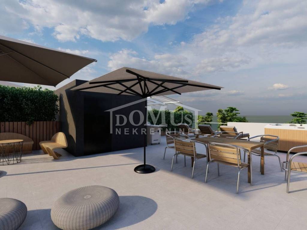 Pakoštane – new development, attractive location, comfortable two-bedroom apartment on the second floor. Apartment S5 is located in a residential building with a total of 6 apartments. It features a modern design and functional layout, with a total usable area of 115.70 m². The apartment consists of an entrance hall, two bedrooms with access to a terrace of 10.25 m², two bathrooms, and a spacious open-plan kitchen with dining and living area, with access to a loggia of 17.46 m². From the staircase, there is access to a roof terrace of 101.49 m², ideal for relaxation. It is equipped with high-quality materials: underfloor heating, a combination of ceramic tiles and parquet flooring throughout the apartment, triple-glazed windows, and electrically operated shutters. Air conditioning units are installed in the living room and all bedrooms. The apartment includes one parking space. The expected move-in date is summer 2026. The buyer is exempt from the 3% property tax. The property is located 600 m from the beach and 650 m from the town center.