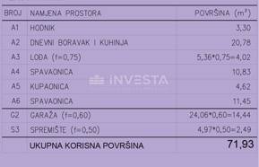 Apartment E1 is located on the first floor of the second building and has been carefully designed to provide maximum functionality and comfort. The total area is 71.93 m², with 55 m² of living space. It consists of an entrance hall, an open-plan living room connected to the kitchen and dining area, two bedrooms, a bathroom, and a loggia that offers additional space for relaxation. On the ground floor, the apartment includes a private garage parking space and a storage room, further enhancing everyday practicality.