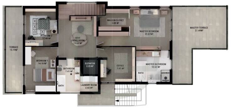KAT: se sastoji od 2 spavaće sobe, dječje dnevne sobe, glavne spavaće sobe, 2 kupaone, walk - in ormara, radne sobe i vešeraja.