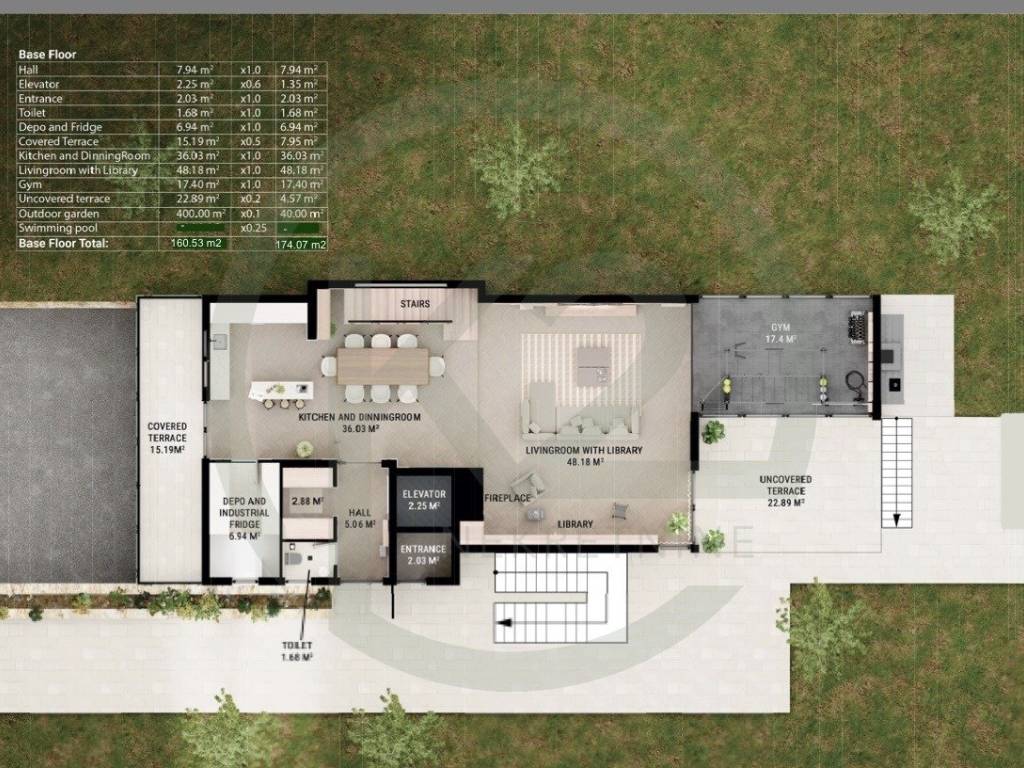 PRIZEMLJE: se sastoji od ulaznog prostora, lifta, hodnika, WC-a, depo i hladnjače, natkrivene terase, kuhinje, blagovaonice i dnevnog boravaka + knjižnice, teretane i nenatkrivene terase.