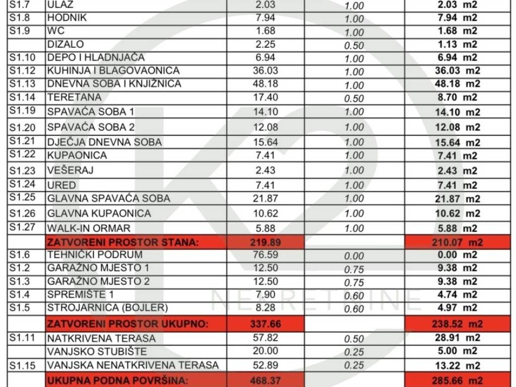 Stan je ukupne neto površine 316,91 m, korisne površine 493,37 m2.