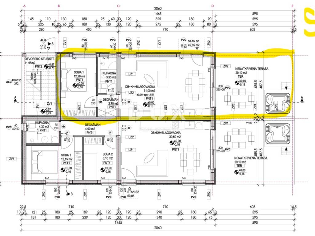 There are 4 apartments in the building, 2 on the ground floor and 2 on the first floor. The apartments on the ground floor have a garden and an uncovered terrace overlooking the forest, that is, on land where construction is not allowed, while the apartments on the first floor have a spacious roof terrace with a view of the sea.