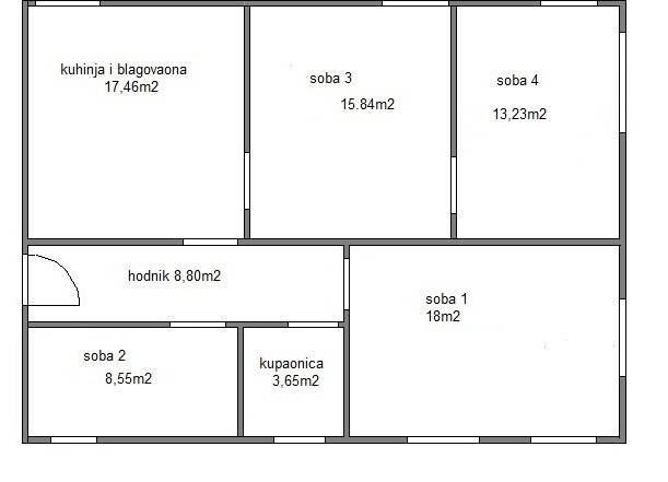 Sastoji se od hodnika, kuhinje sa blagovaonicom, 4 sobe i kupaone sa tušem i wc-om.