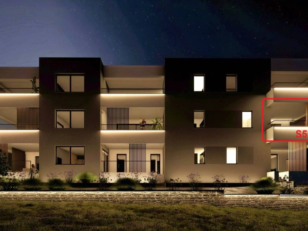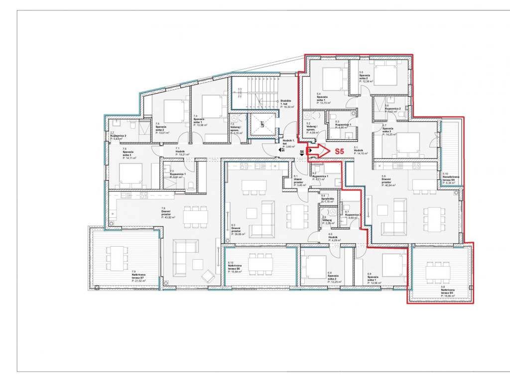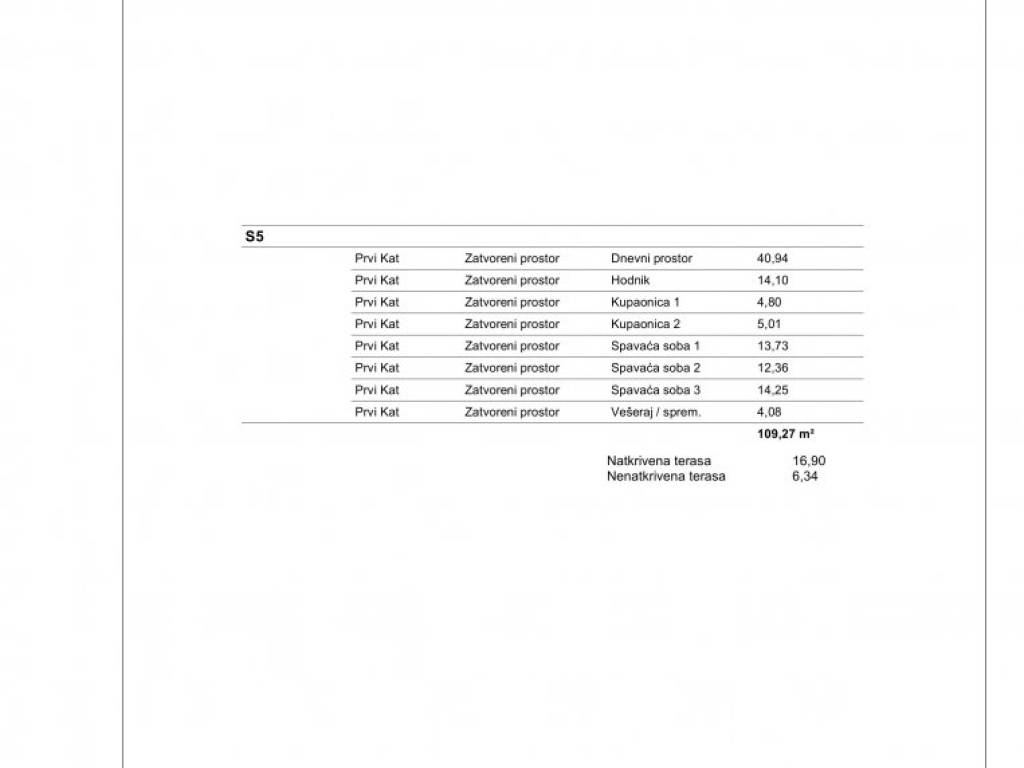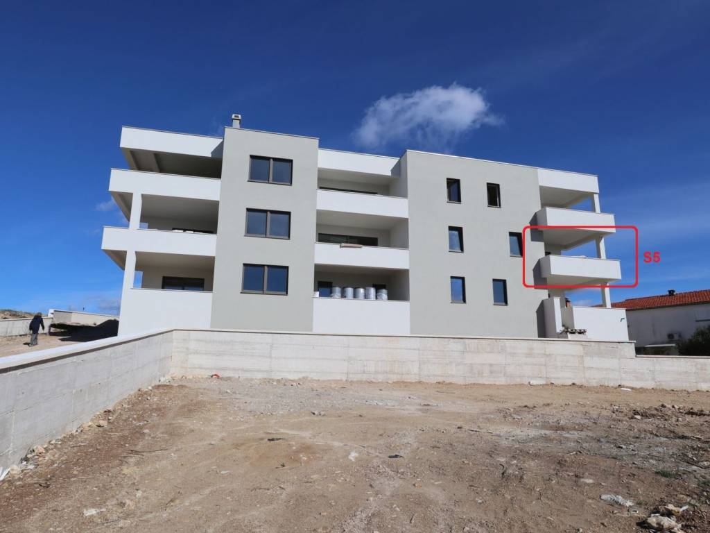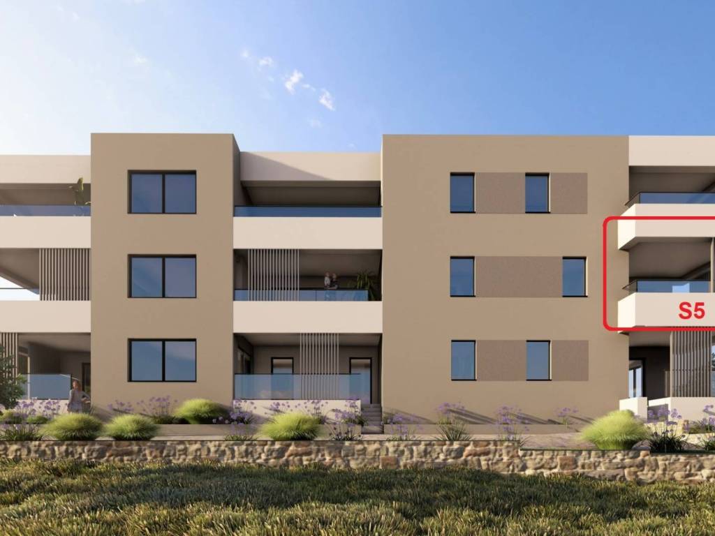The apartment marked S5 is located on the first floor of the building. It consists of three bedrooms, a kitchen-dining room-living room, two bathrooms, a toilet/laundry room, a hallway, two covered terraces. The apartment has one storage room in the basement and one parking space (an additional parking space can be purchased).