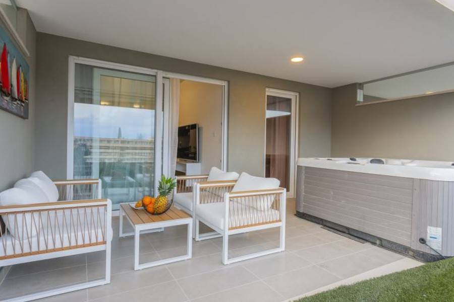 Жилая площадь квартиры составляет около 43 м. Она состоит из одной спальни, ванной комнаты и прихожей, ведущей в открытое пространство, где расположены кухня, столовая и гостиная. Из гостиной есть выход на лоджию и в сад площадью около 28 м.
