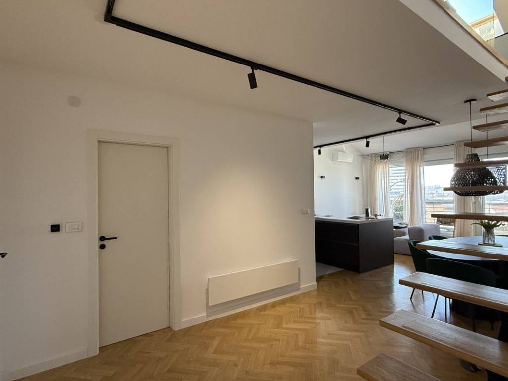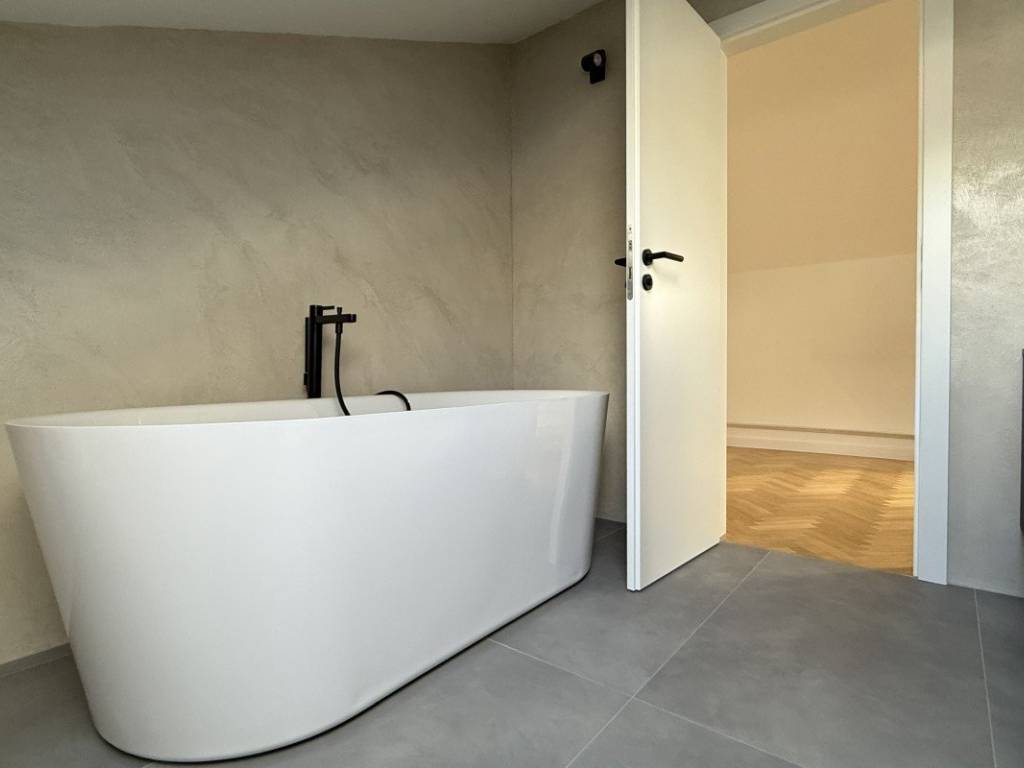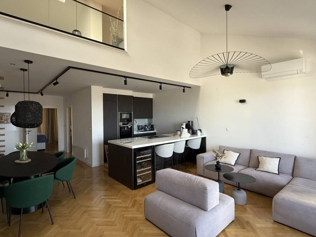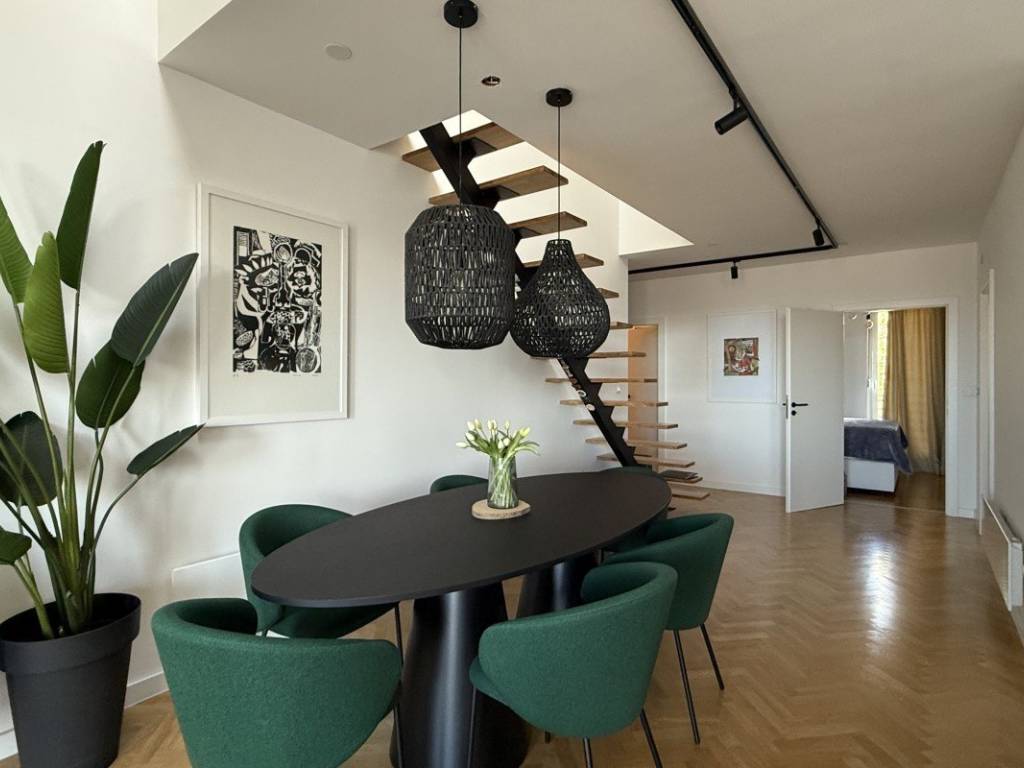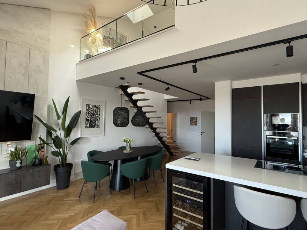 Внутренняя лестница ведет в галерею, где есть дополнительная ванная комната и дополнительное пространство, идеально подходящее для рабочего уголка, спальни или зоны отдыха. Каждый квадратный метр квартиры был тщательно использован, создавая ощущение простора и домашнего тепла.
