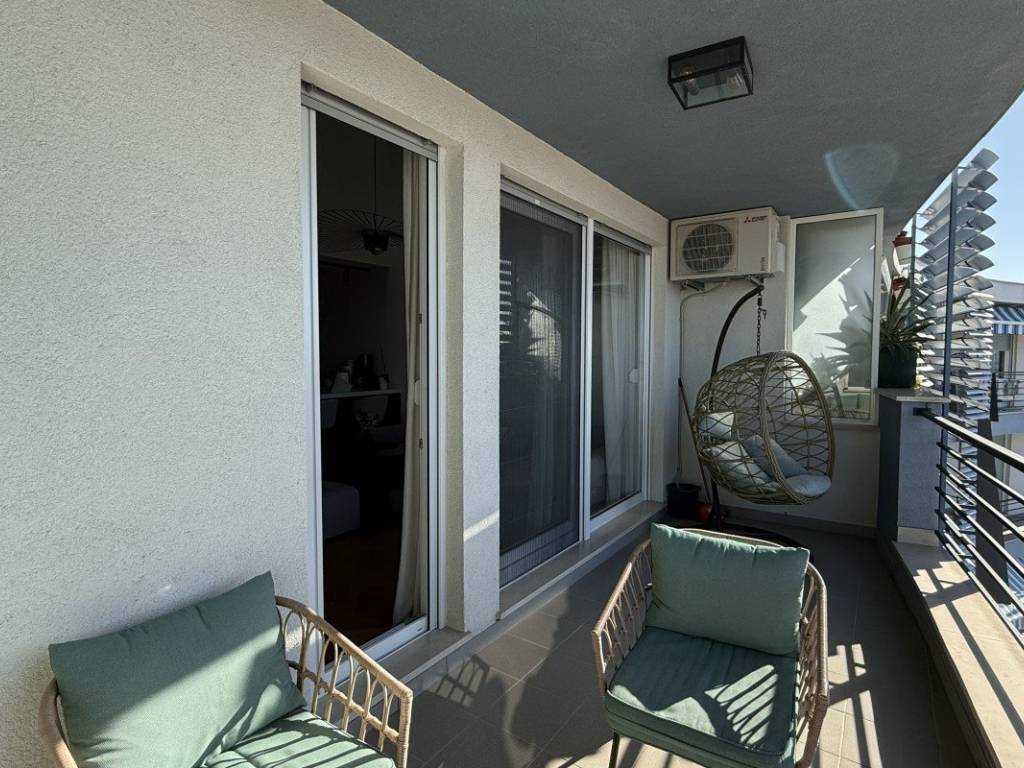 Квартира расположена на третьем этаже качественно построенного дома общей площадью около 115 м. Она состоит из просторной прихожей, двух спален, в главной из которых есть собственная гардеробная, элегантно оборудованных ванных комнат и гостиной открытой планировки, объединяющей кухню, столовую и гостиную. Из гостиной есть выход на просторную лоджию площадью около 12 м, откуда открывается прекрасный вид на море и окрестности.