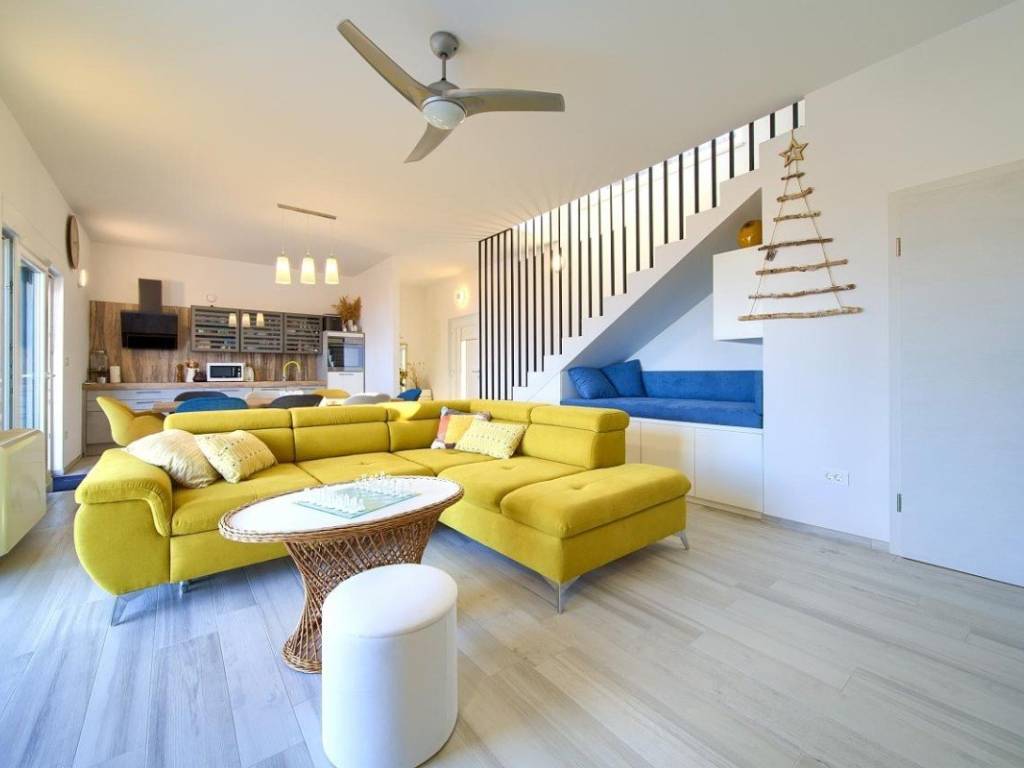 Продаётся новая городская сблокированная вилла общей жилой площадью 126,78 м с просторным садом, бассейном и видом на море. В подвале находятся техническое помещение, кухня, туалет и таверна. На первом этаже находятся прихожая, туалет, спальня с собственной ванной комнатой, гостиная, кухня и столовая с выходом на крытую террасу с зоной для загара и бассейном с подогревом. На втором этаже расположены три спальни, две ванные комнаты и терраса с открытым видом на море.